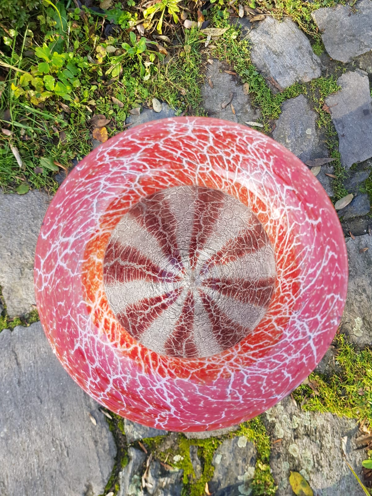 Measuring 25 cm in height and 20 cm in diameter, the vessel presents clear glass infused with vibrant red-orange and white powder particles that fuse into an intricate crackle and webbed surface.