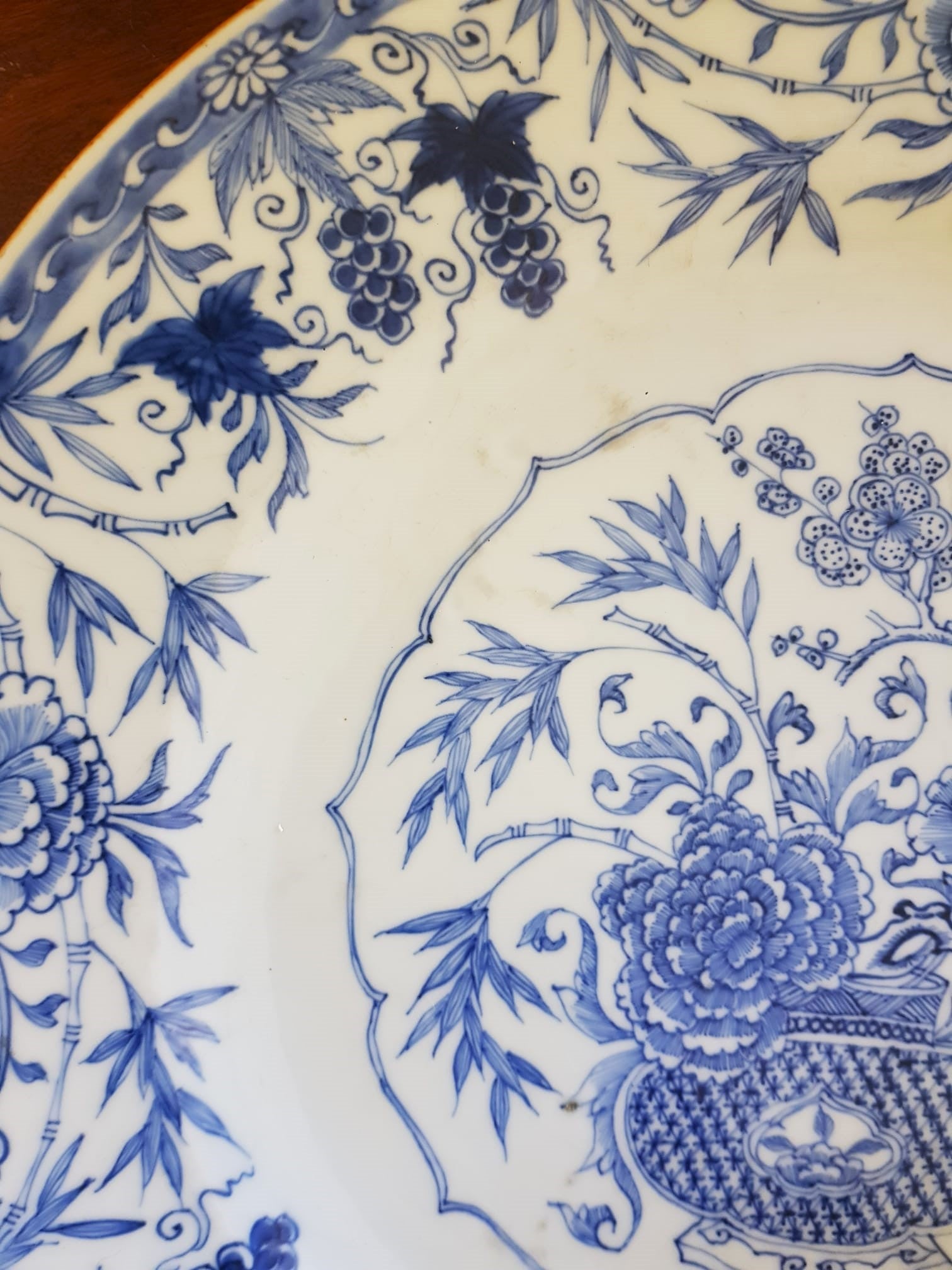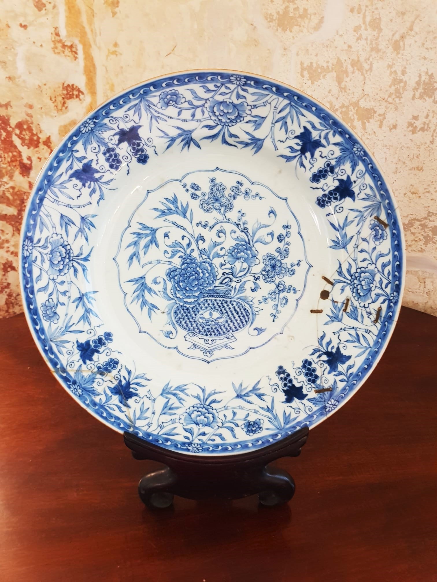 This 18th-century porcelain plate from China measures 35 cm in diameter and features underglaze blue decoration with intricate floral and leaf motifs.