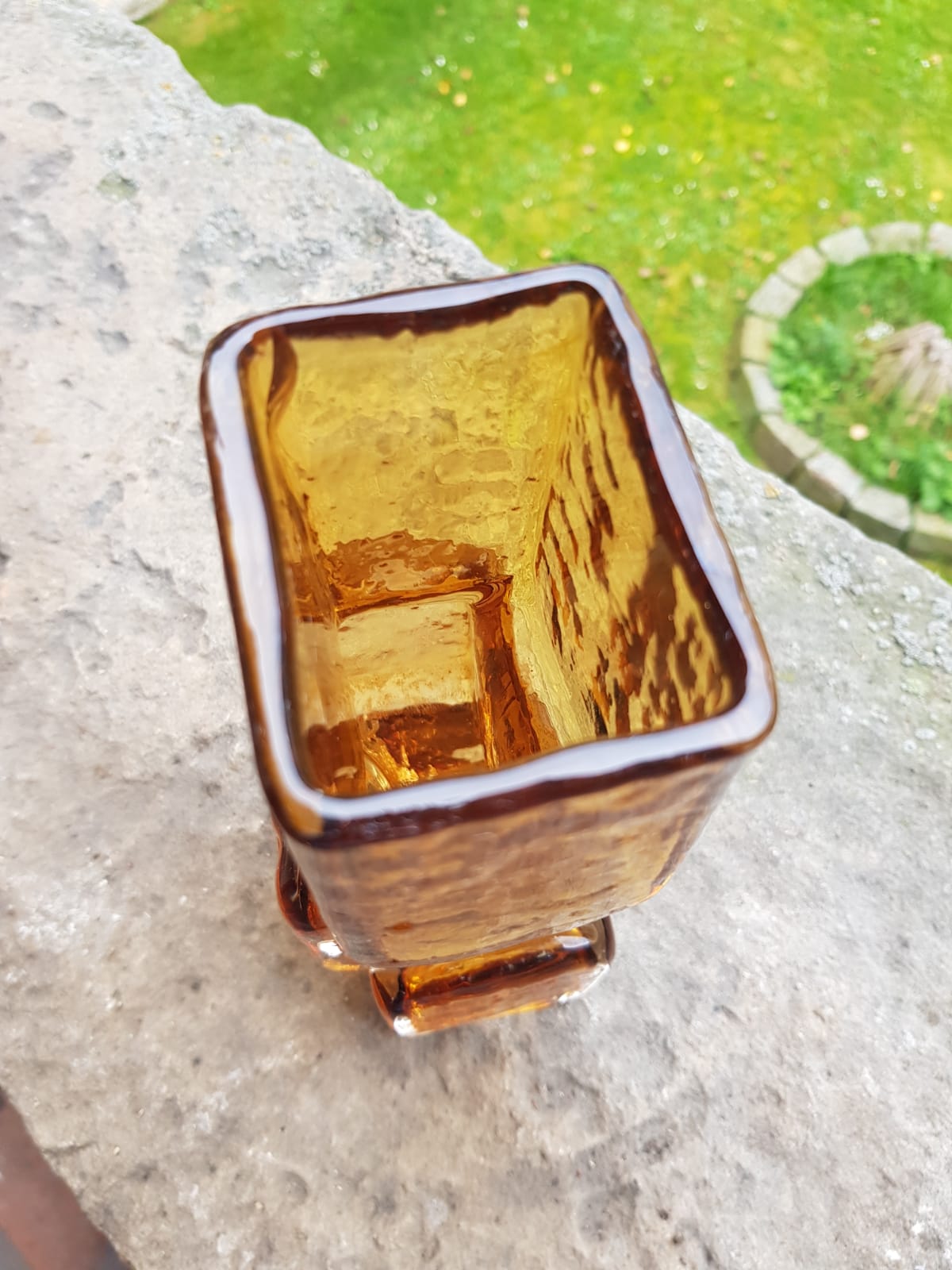 Pressed glass vase by designer Geoffrey Baxter for the British glass company Whitefriars Glass. This iconic piece is called the "Drunken Bricklayer" and belongs to a series of vases with a textured design that Baxter designed in the 1960s. The vases were produced in various colors, including tangerine, cinnamon, and others.