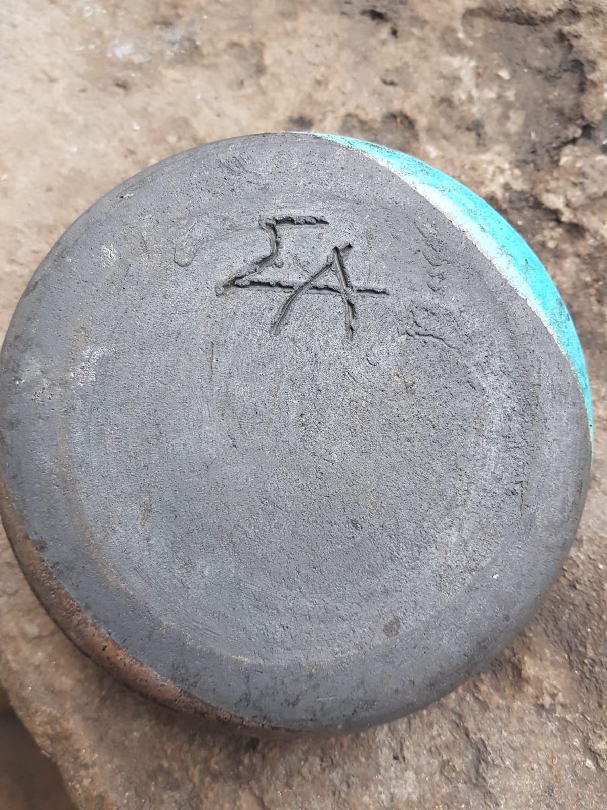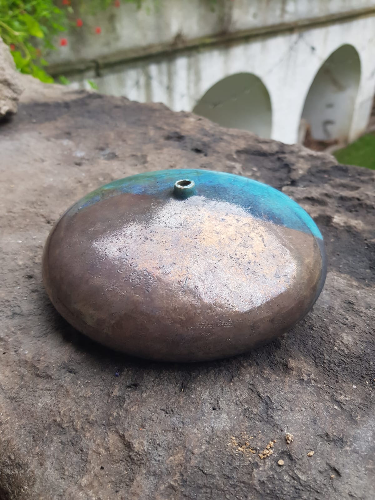 Crafted by hand using the Raku technique, this ceramic vase showcases a unique flat pebble design.