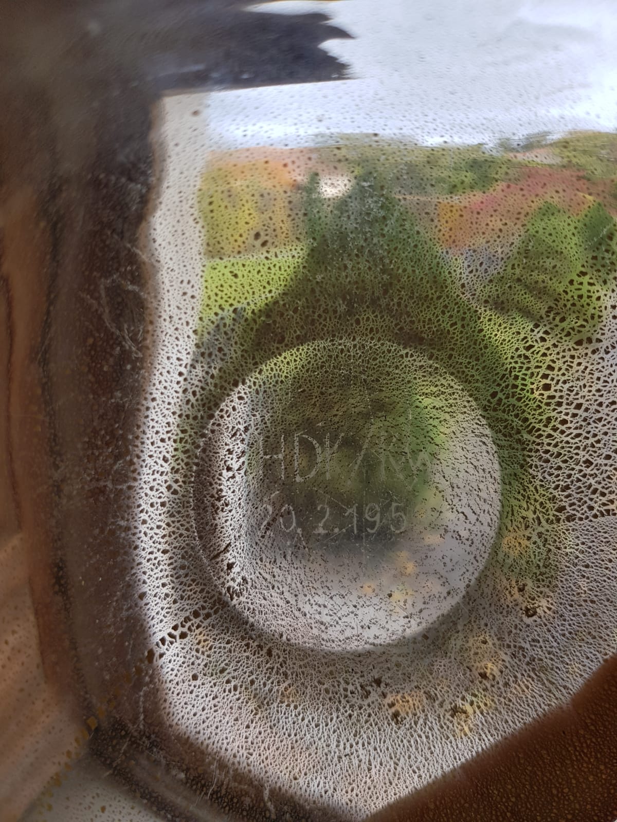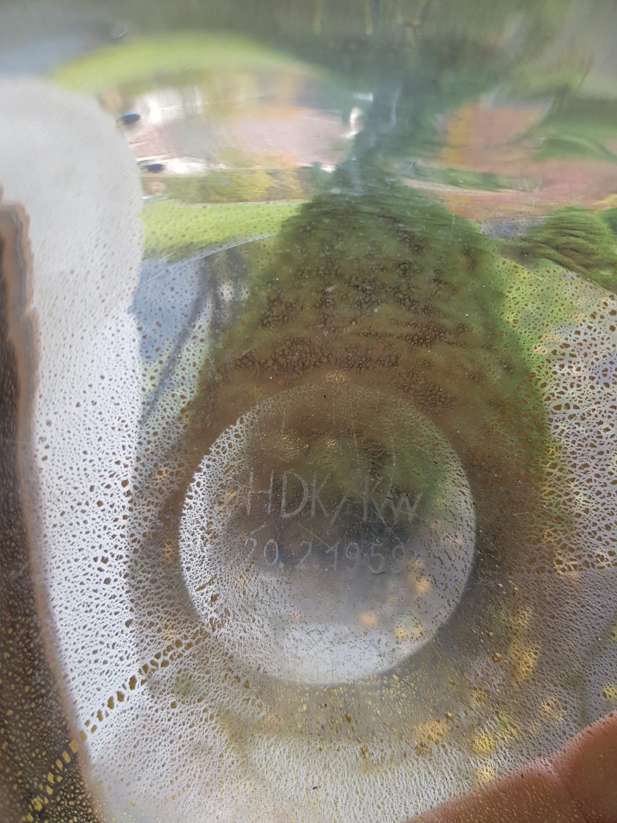 Its organic form is enhanced by encased gold leaf inclusions, a prized element in Murano glass. Signed on the underside with HDK/KW, 20.2.1959, the bowl shows minor age-related wear typical of its era but remains in very good condition. Measuring 13.5 cm in diameter and 8.5 cm high, it is a sophisticated addition to any art glass collection.
