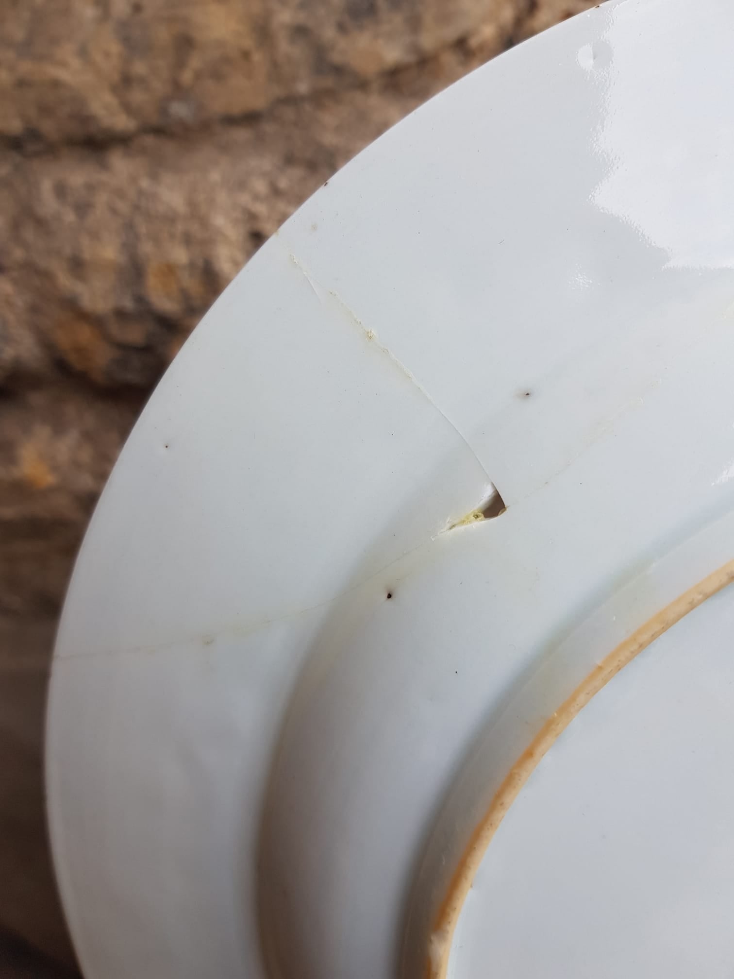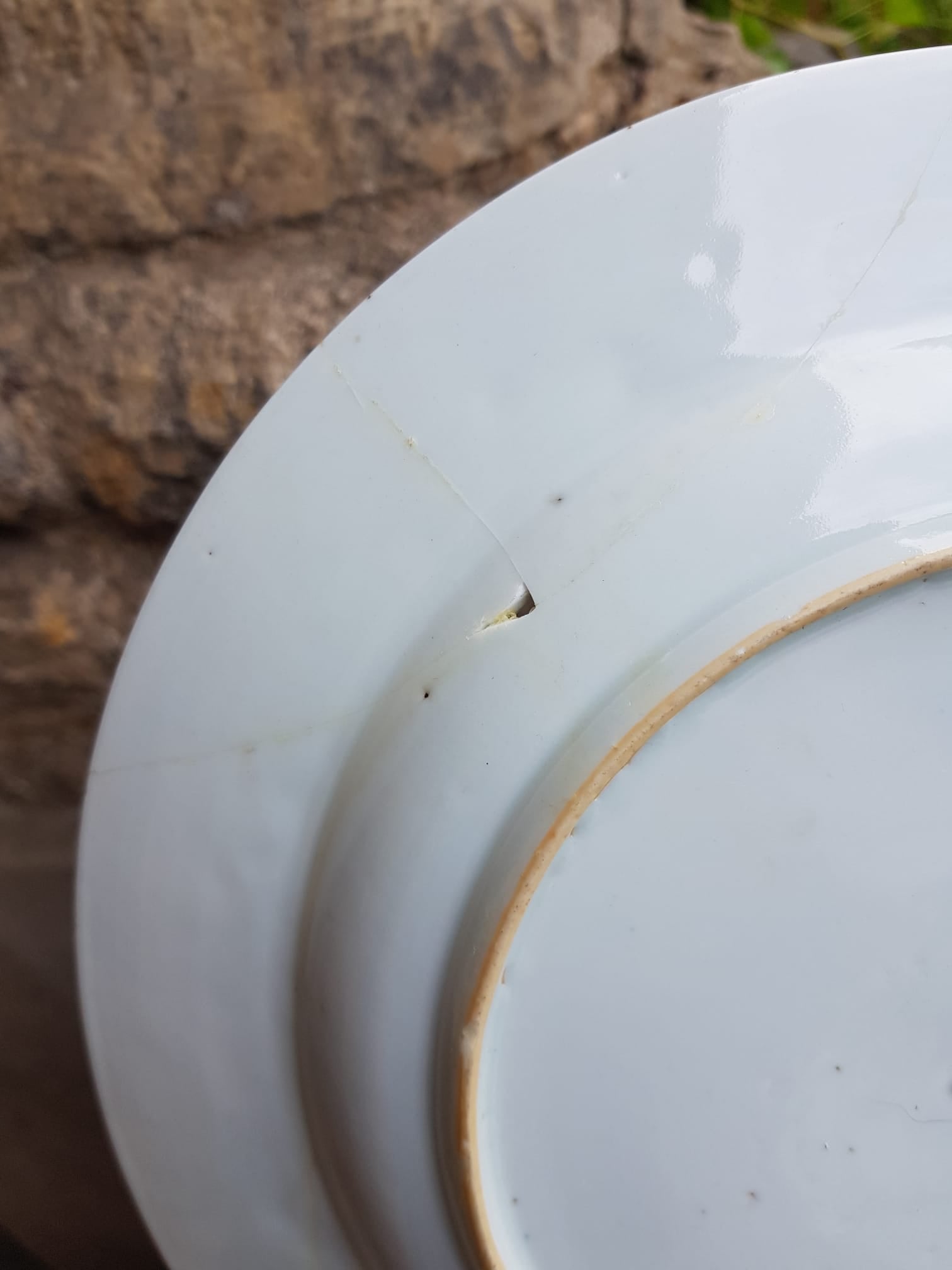 The plate measures 26 cm in diameter and exhibits notable wear, including a crack extending from the rim into the body and a chip near the edge that reveals the unglazed ceramic beneath.