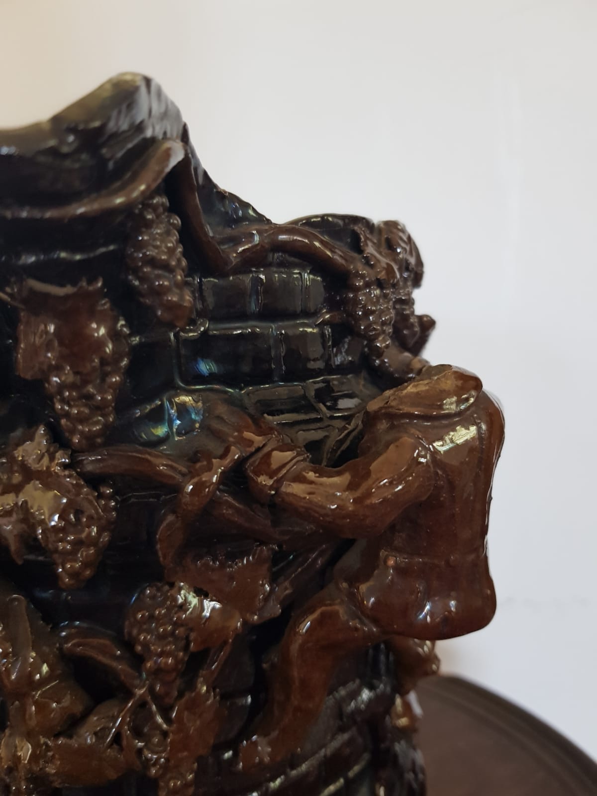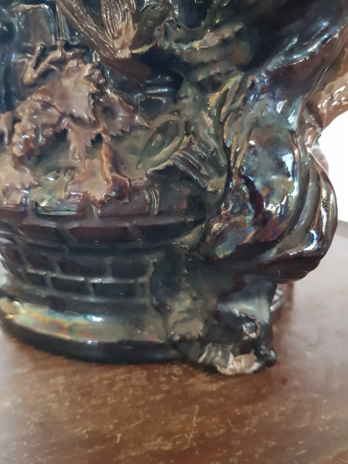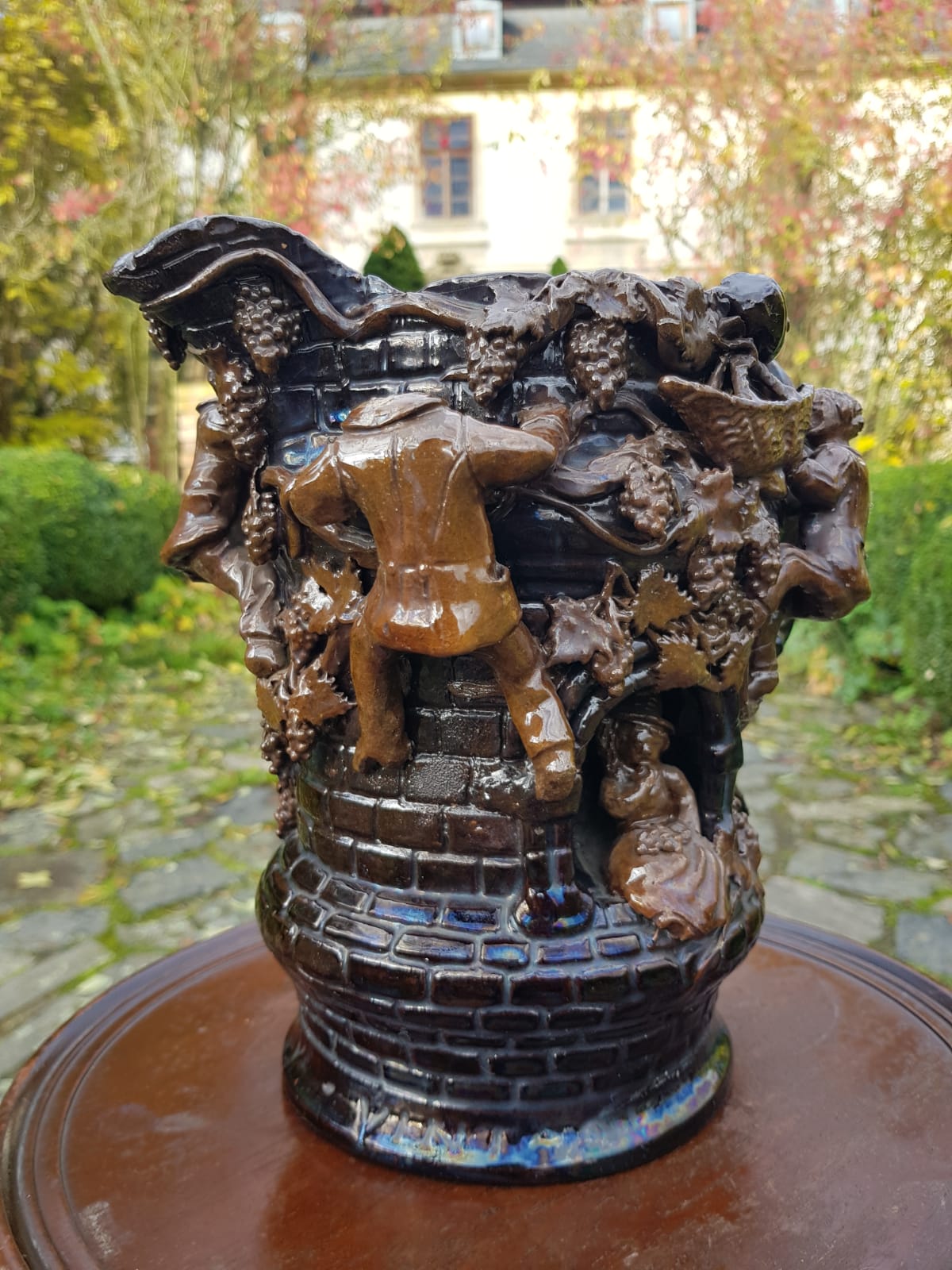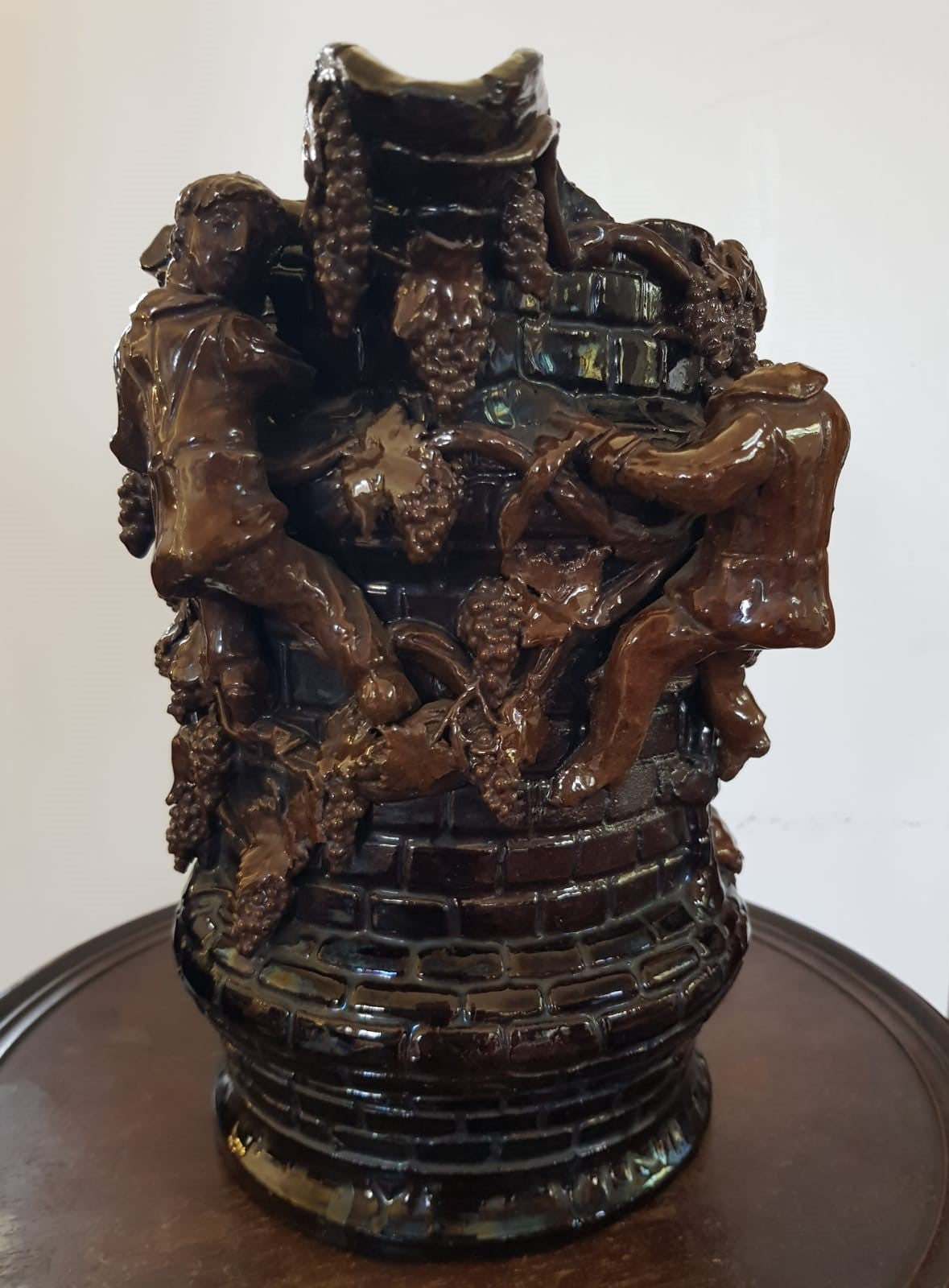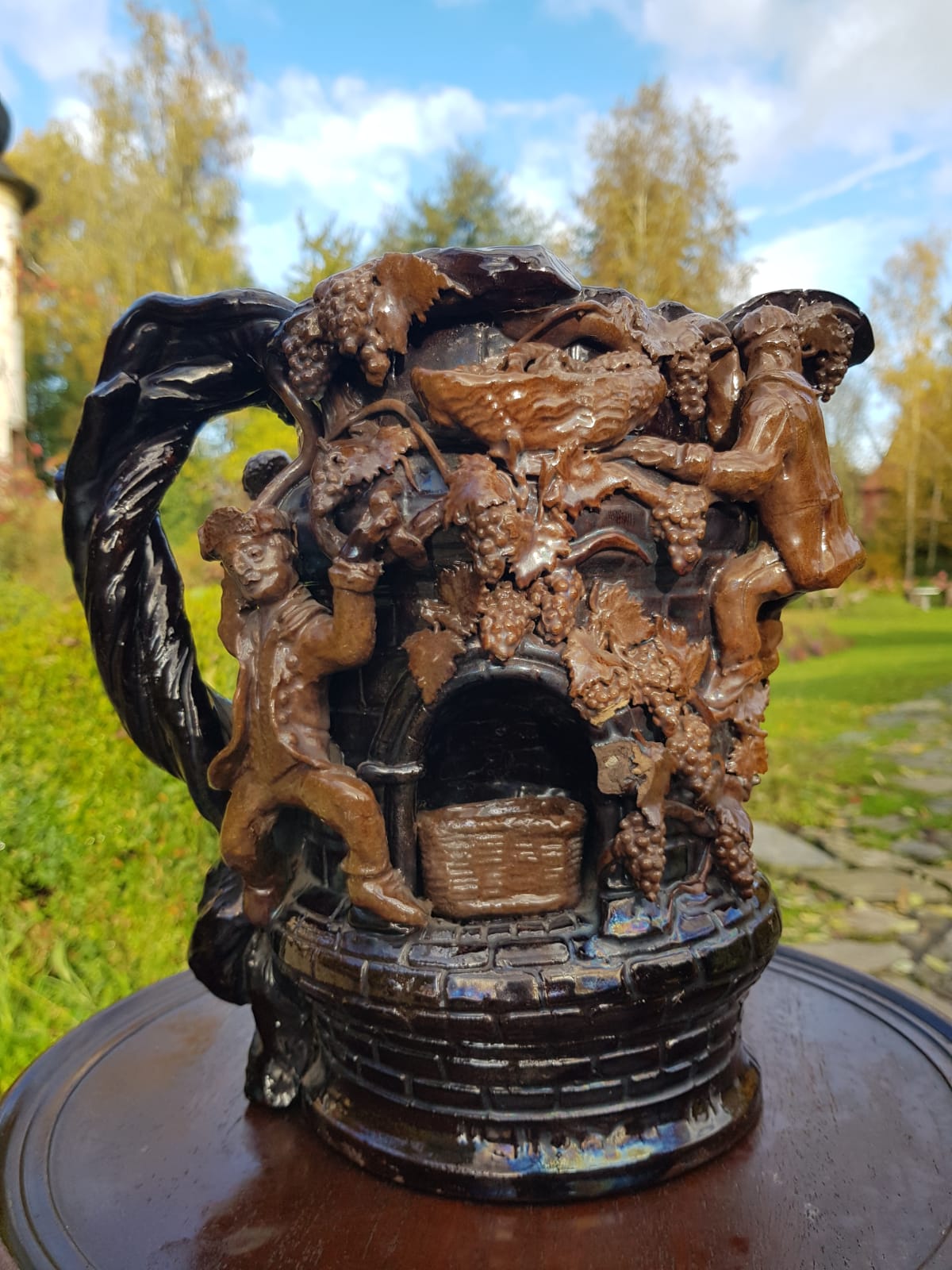 The jug is adorned with detailed grape pickers and vine motifs, with artistically shaped handle.