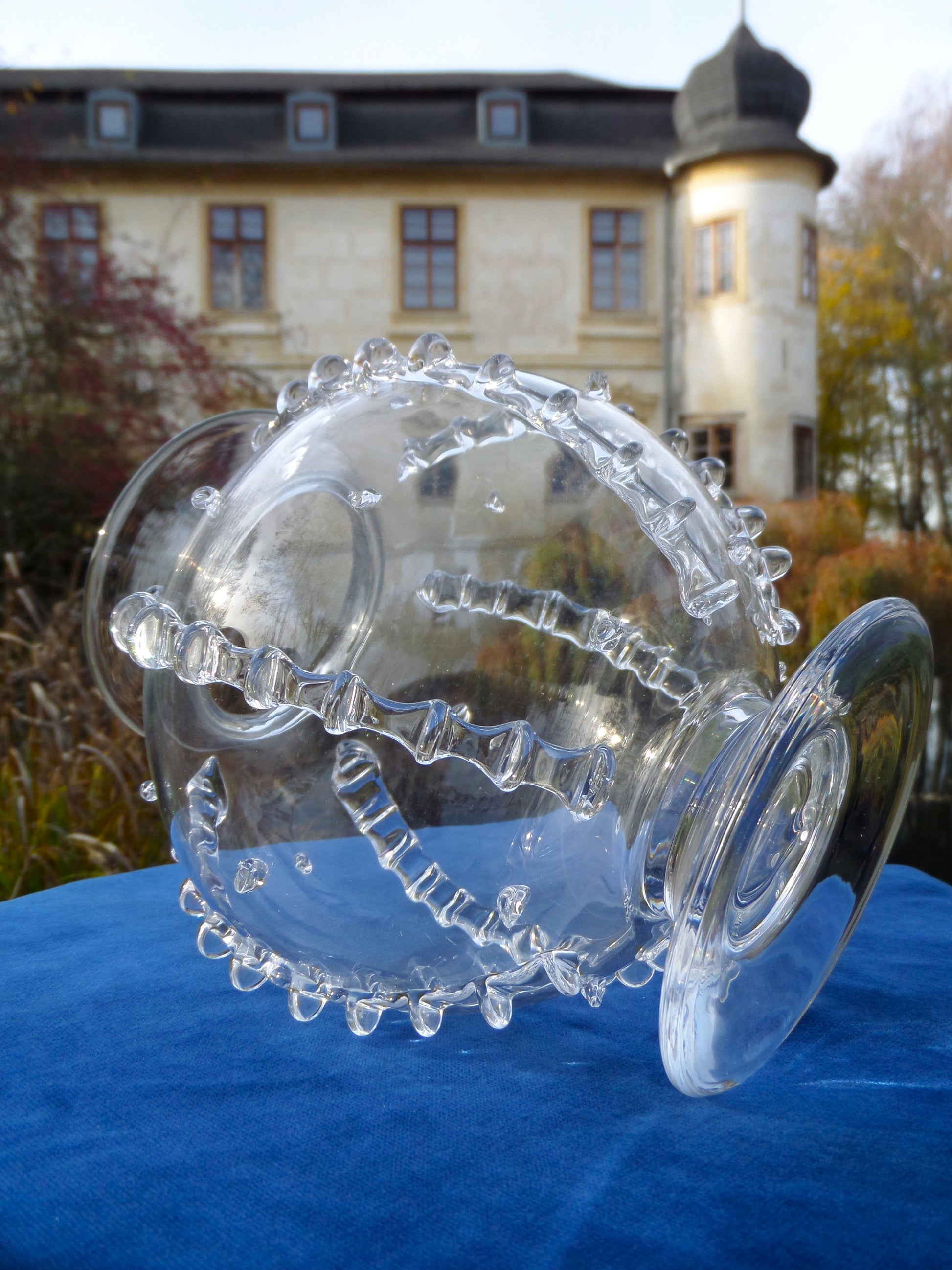 Master artisans employ ancestral techniques to hand-blow each vessel, creating luminous applied ribbons and textured embellishments that refract light with subtle brilliance.