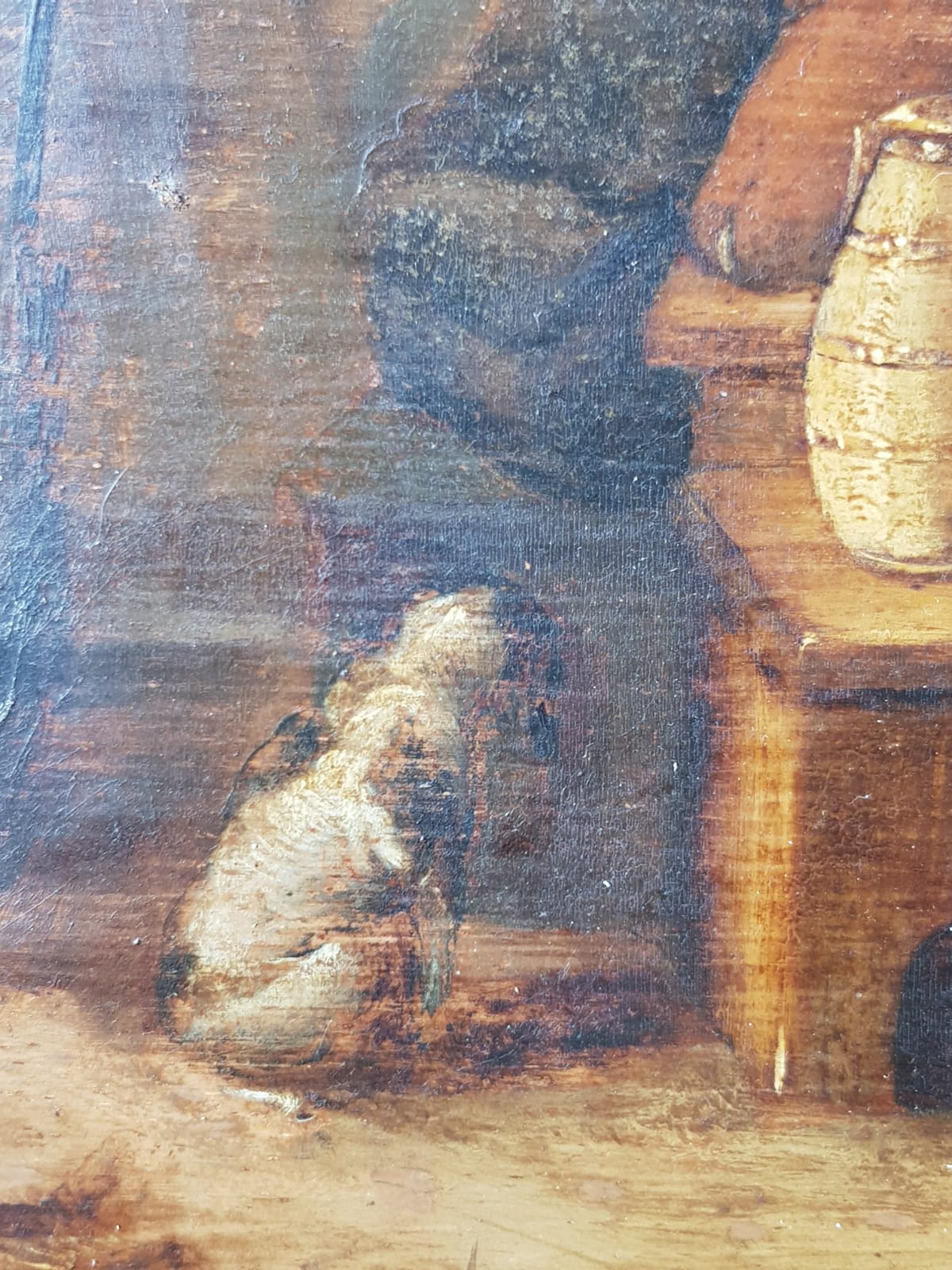 The work depicts a tavern interior where five figures and a small white dog gather around a wooden table in contemplative repose.