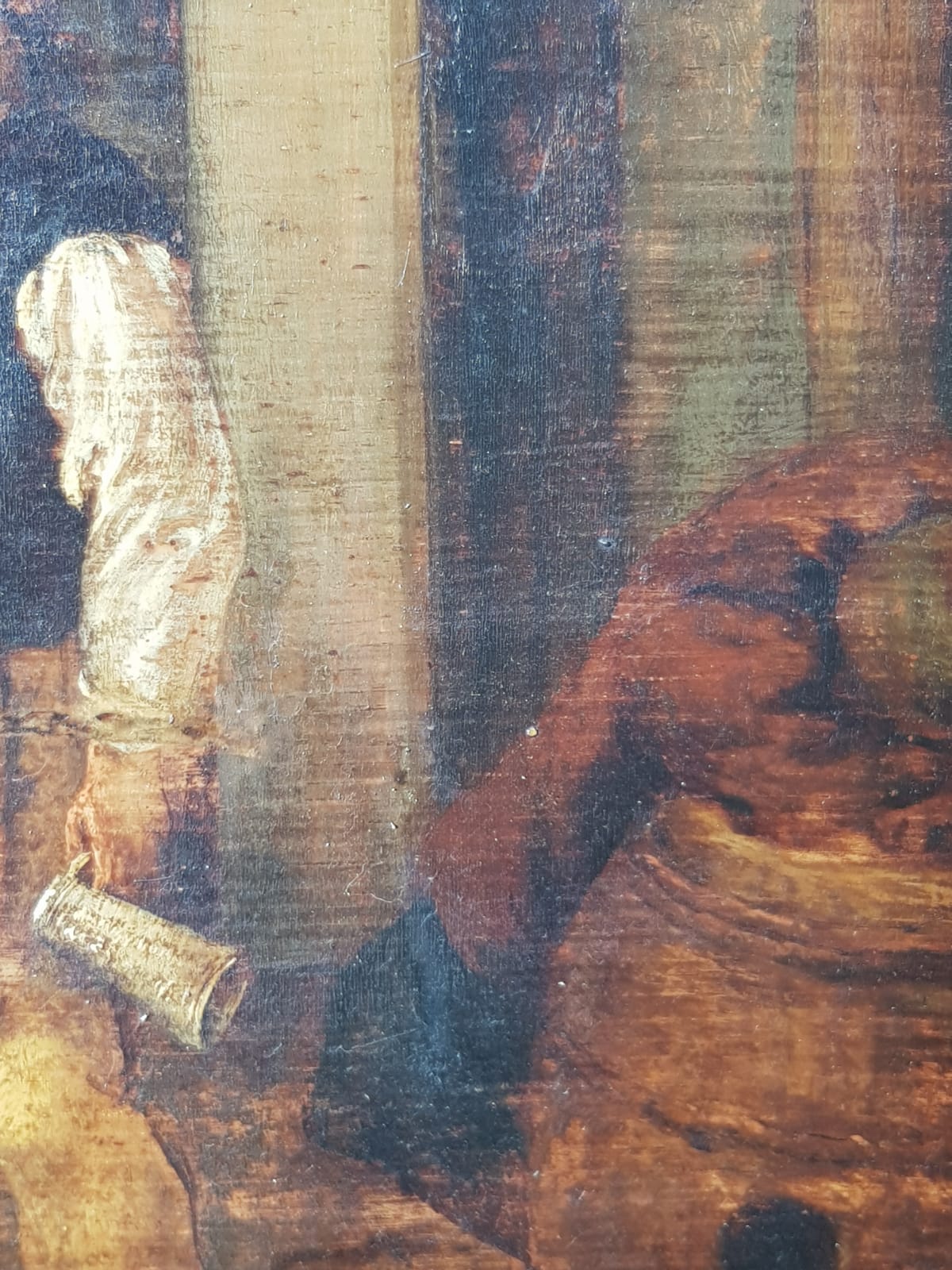 The artist employs nuanced light to animate the central assembly and earthenware vessel, while restrained earth tones and wooden architectural elements establish the austere authenticity of the humble setting.
