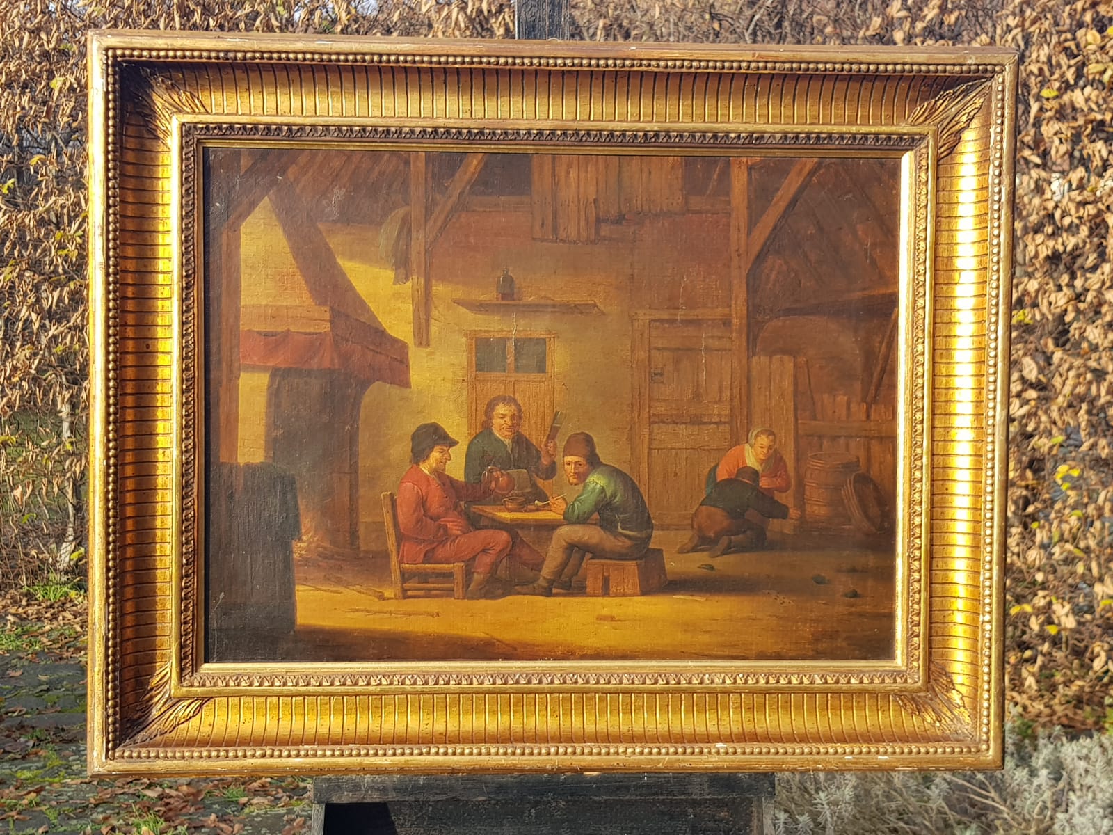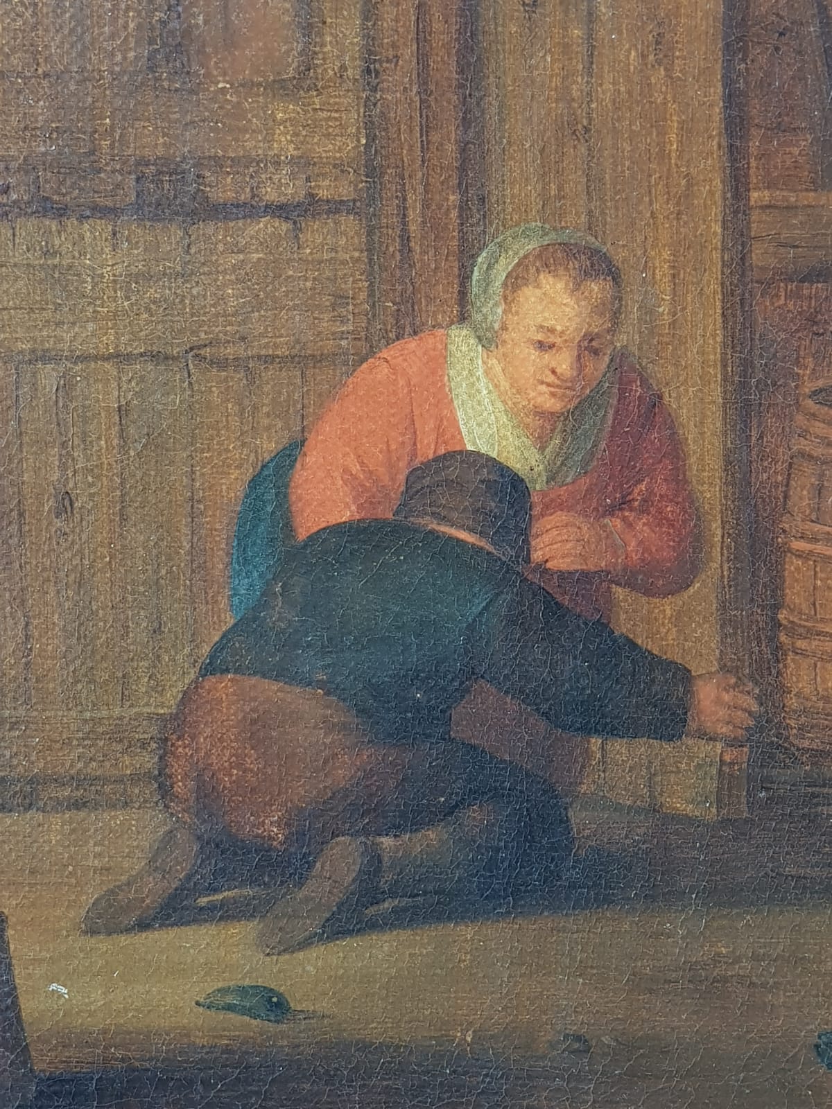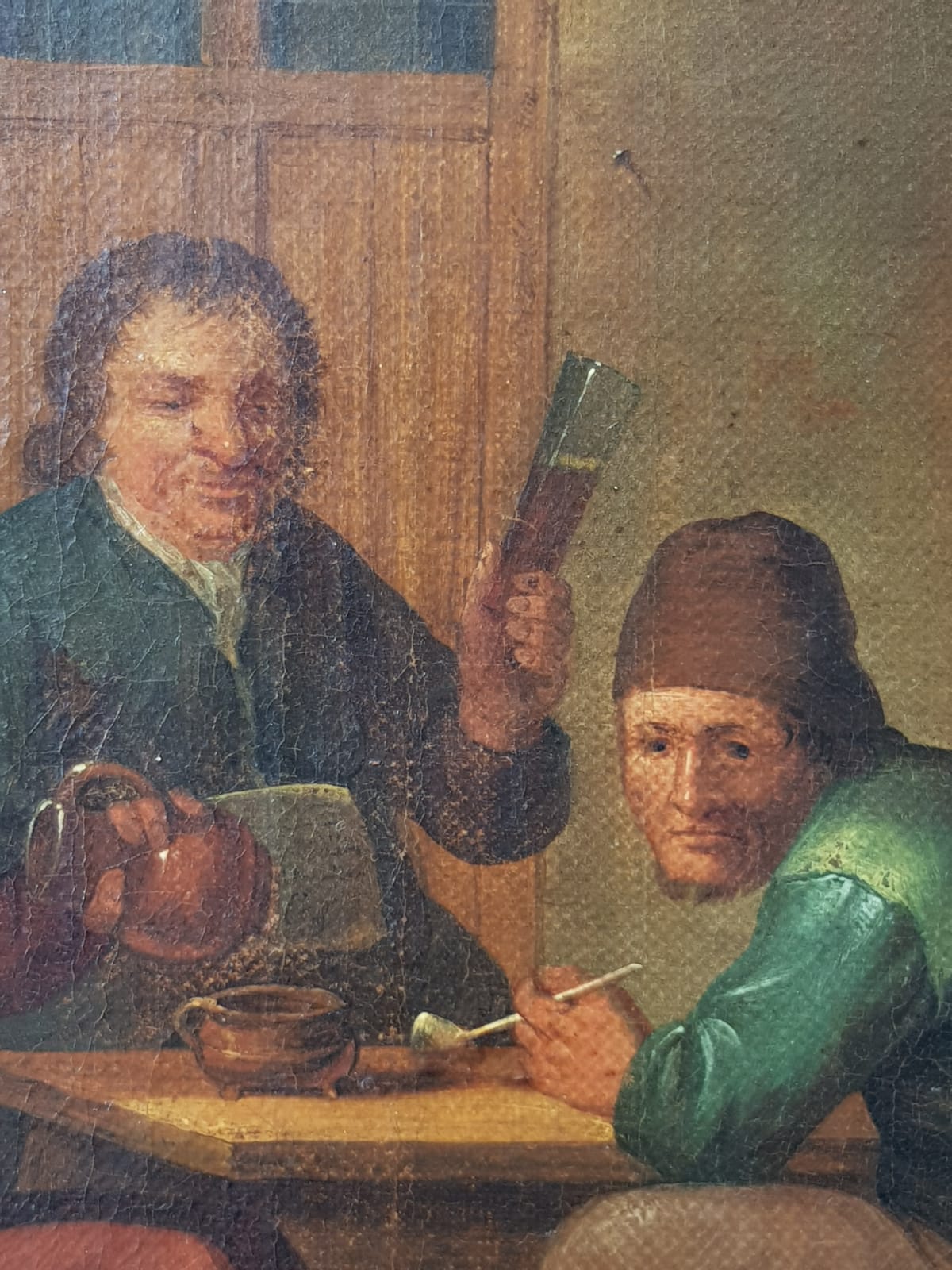Step into a meticulously rendered world of 17th-century tavern life with this exceptional oil on canvas.
