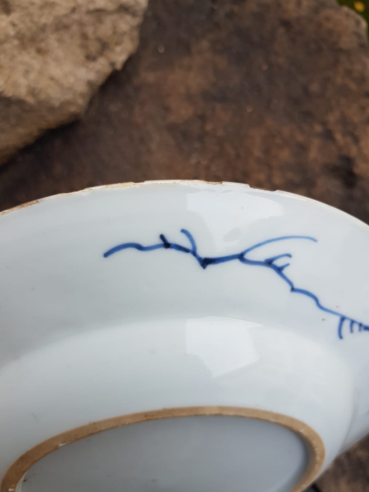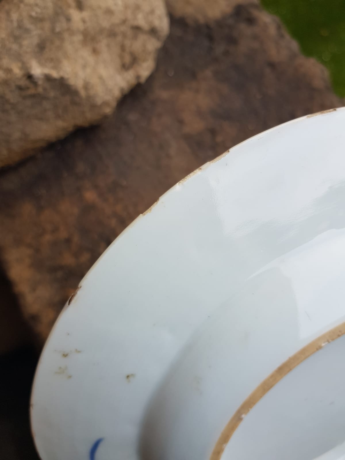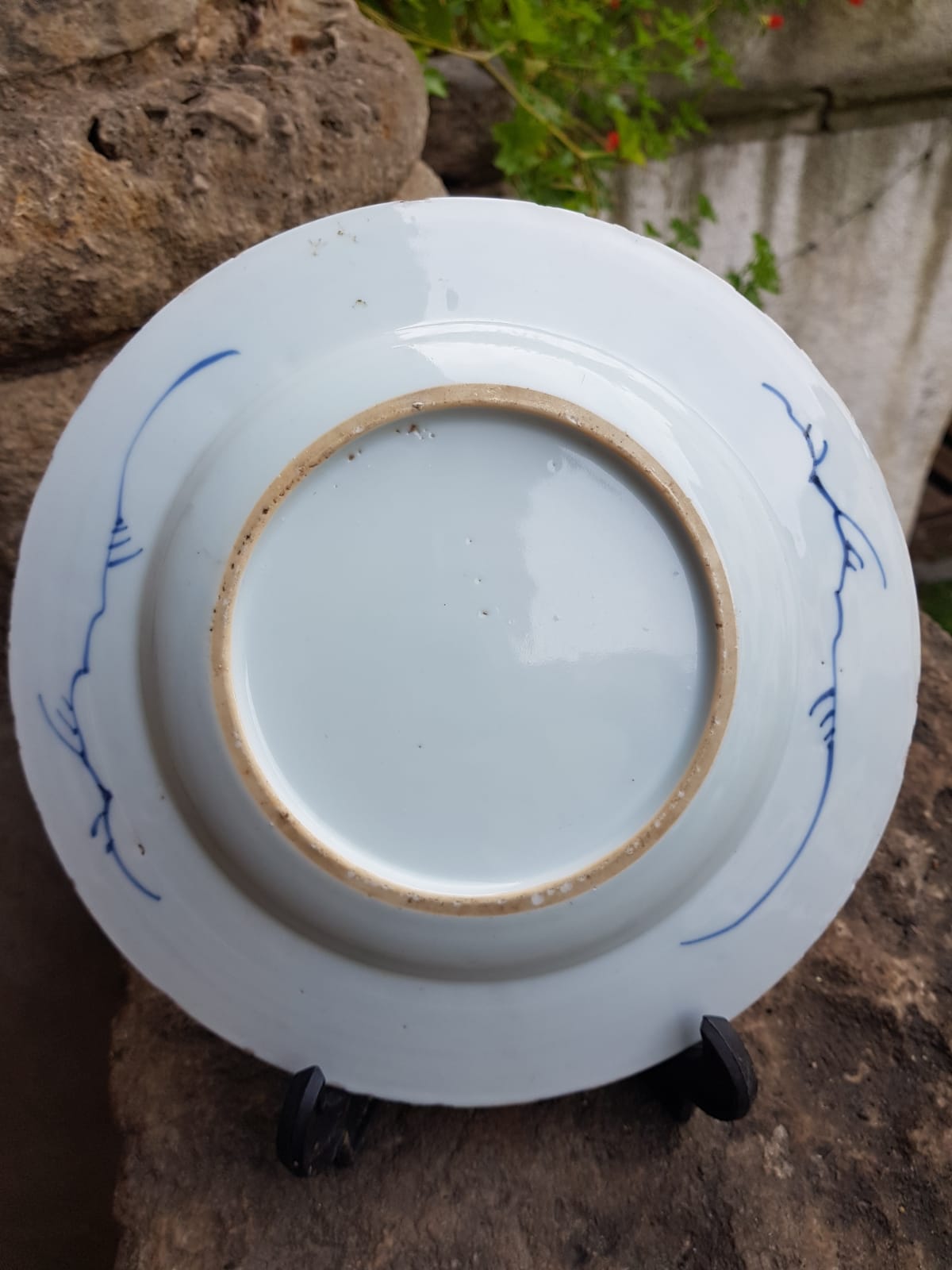 Measuring 22 cm in diameter, this antique piece remains in good condition, exhibiting minor rim chips as detailed in the accompanying photographs.