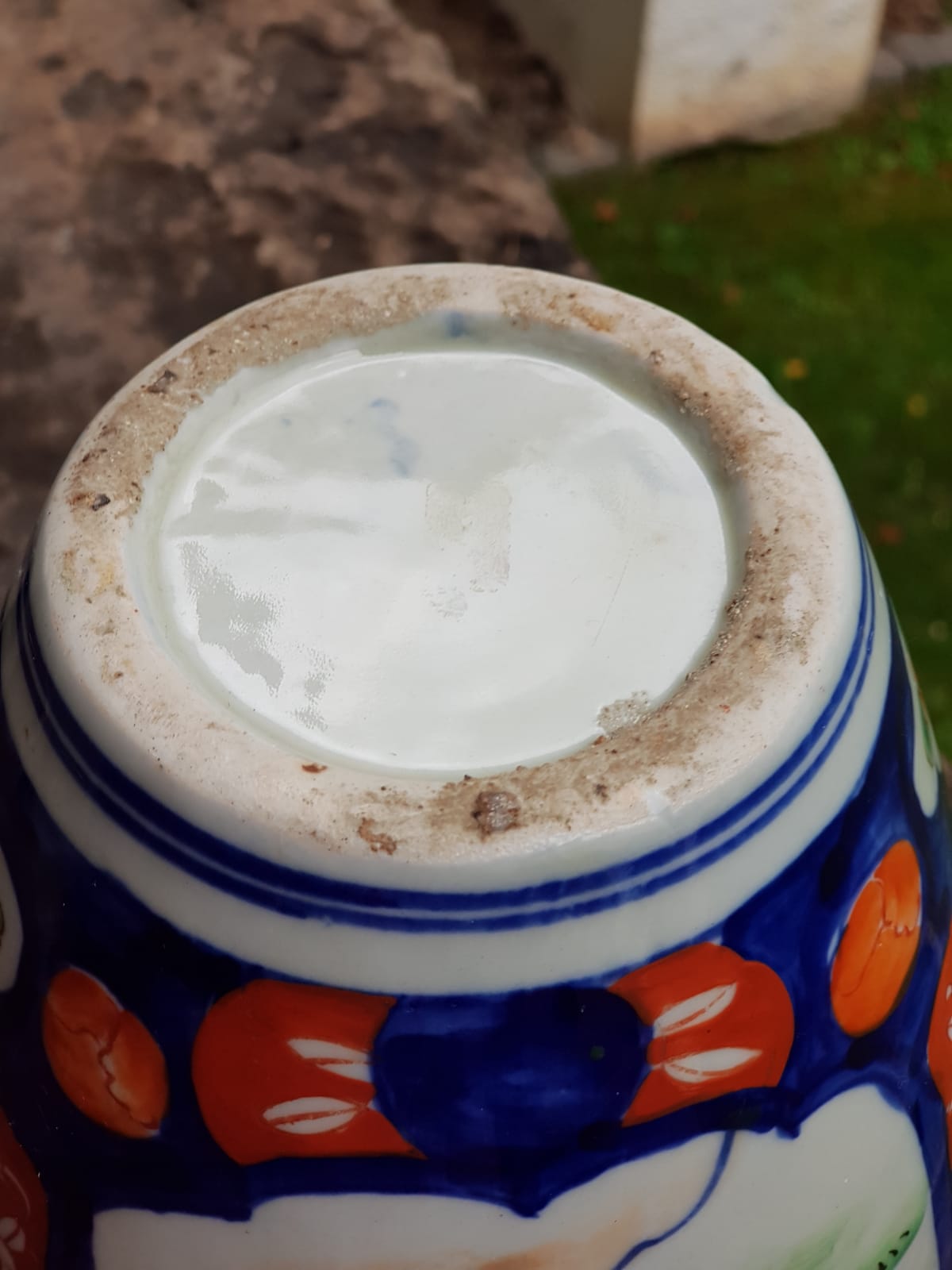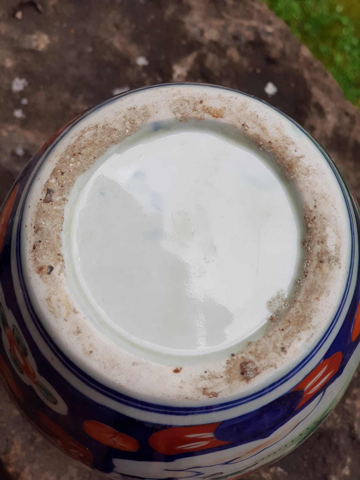 Its decoration exemplifies classic Imari style, combining underglaze cobalt blue, vibrant iron red, and a white background, enhanced by touches of green, yellow, and gold.