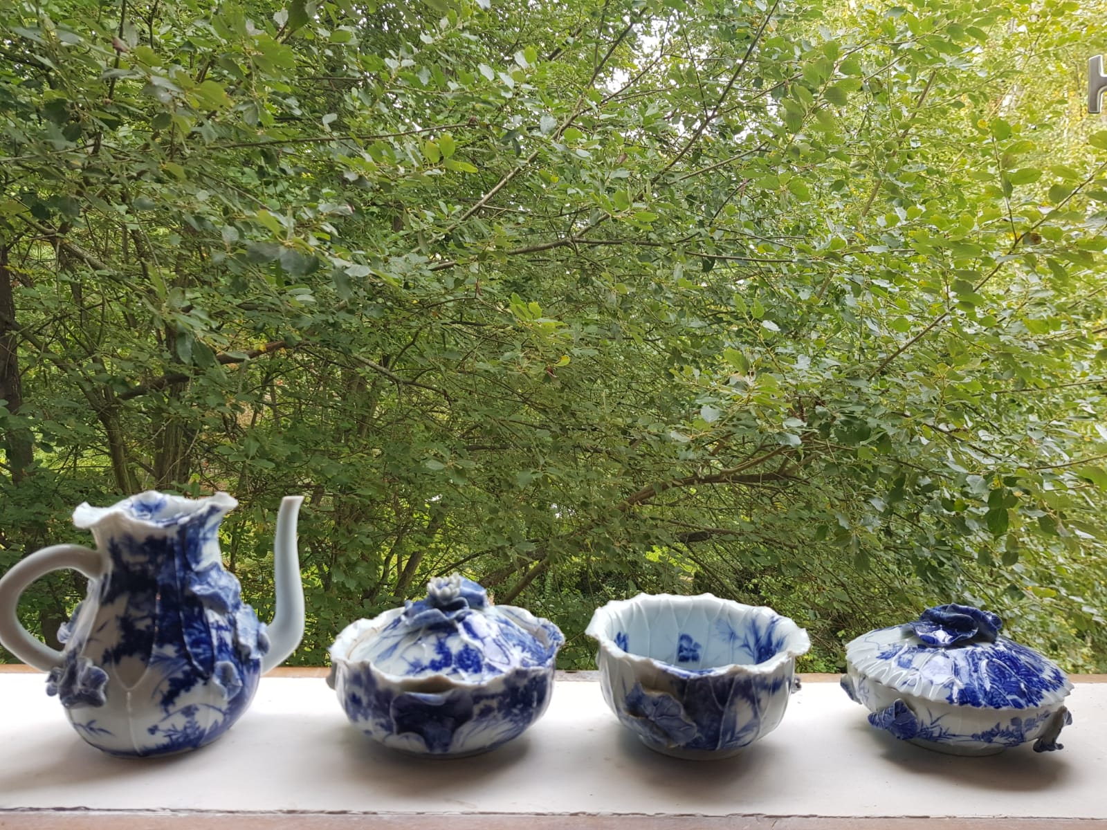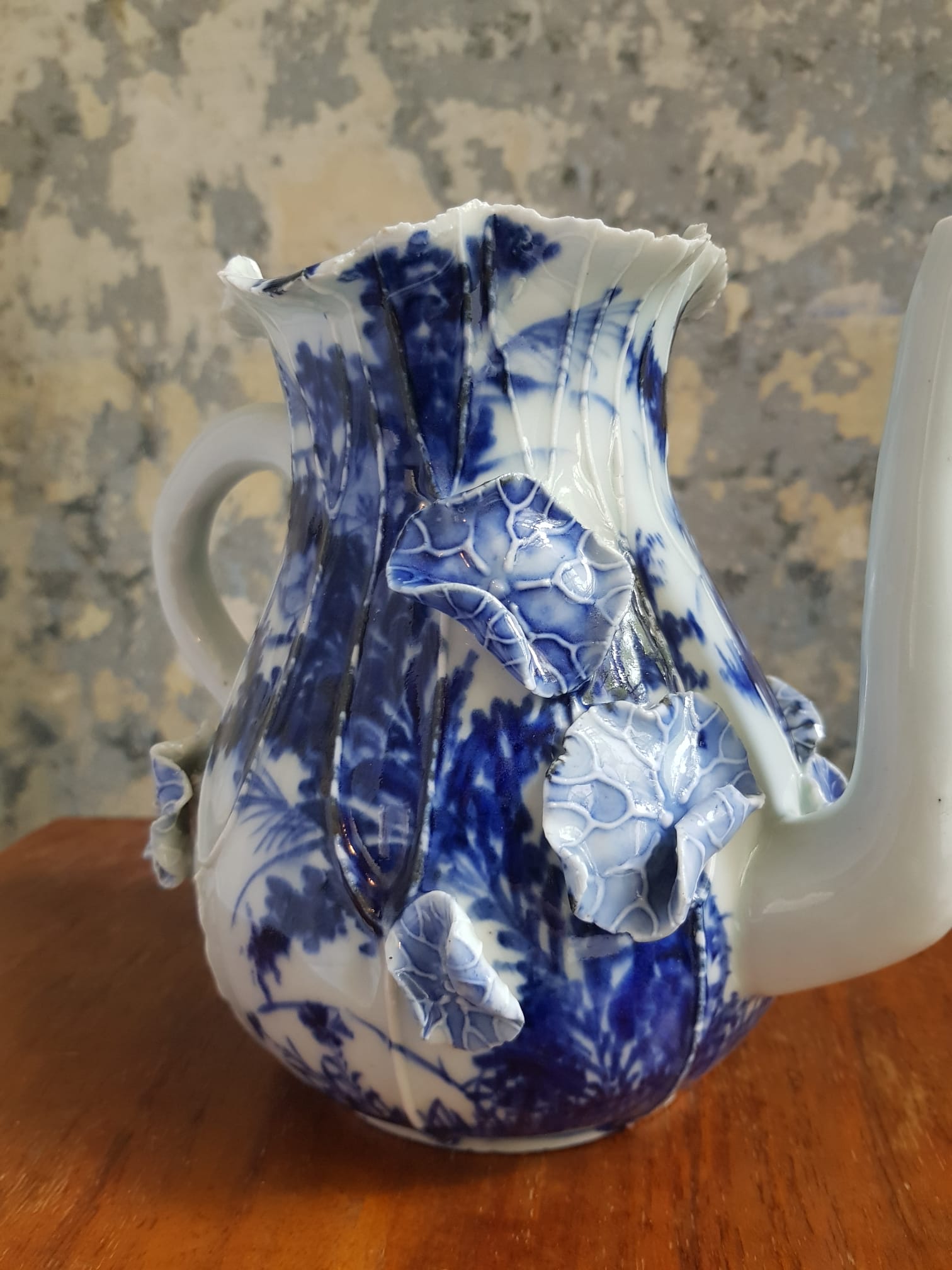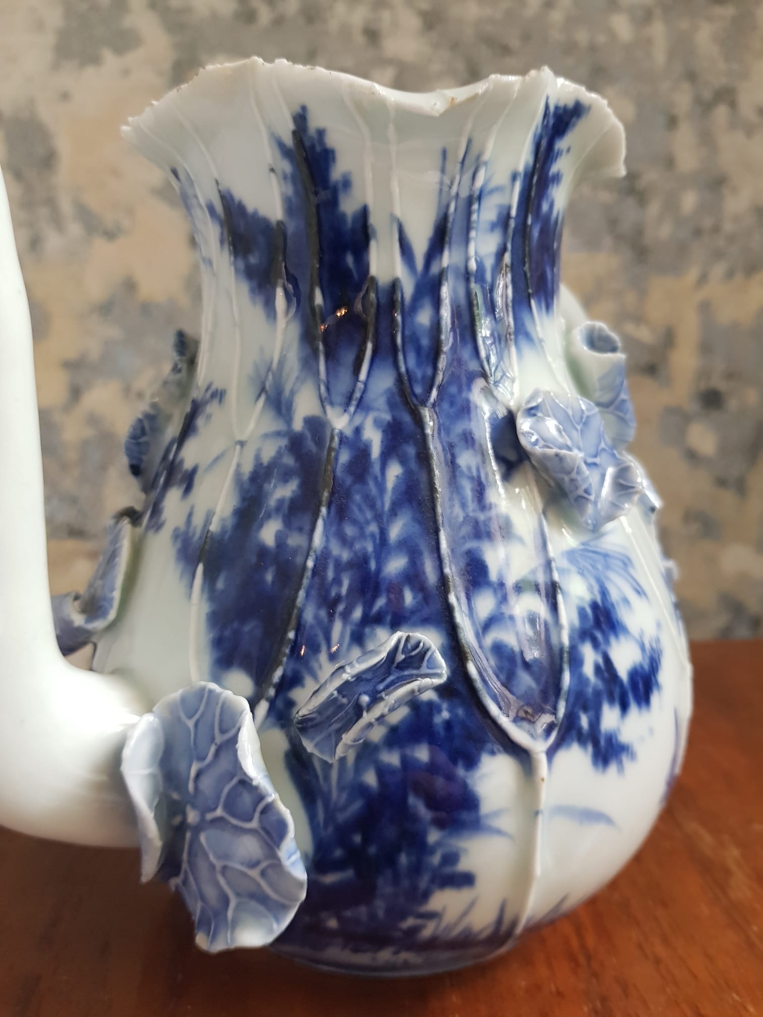 This elegant vessel features the characteristic sometsuke technique—underglaze blue and white decoration—rendered through both meticulous hand-painting and sculptural high-relief elements.