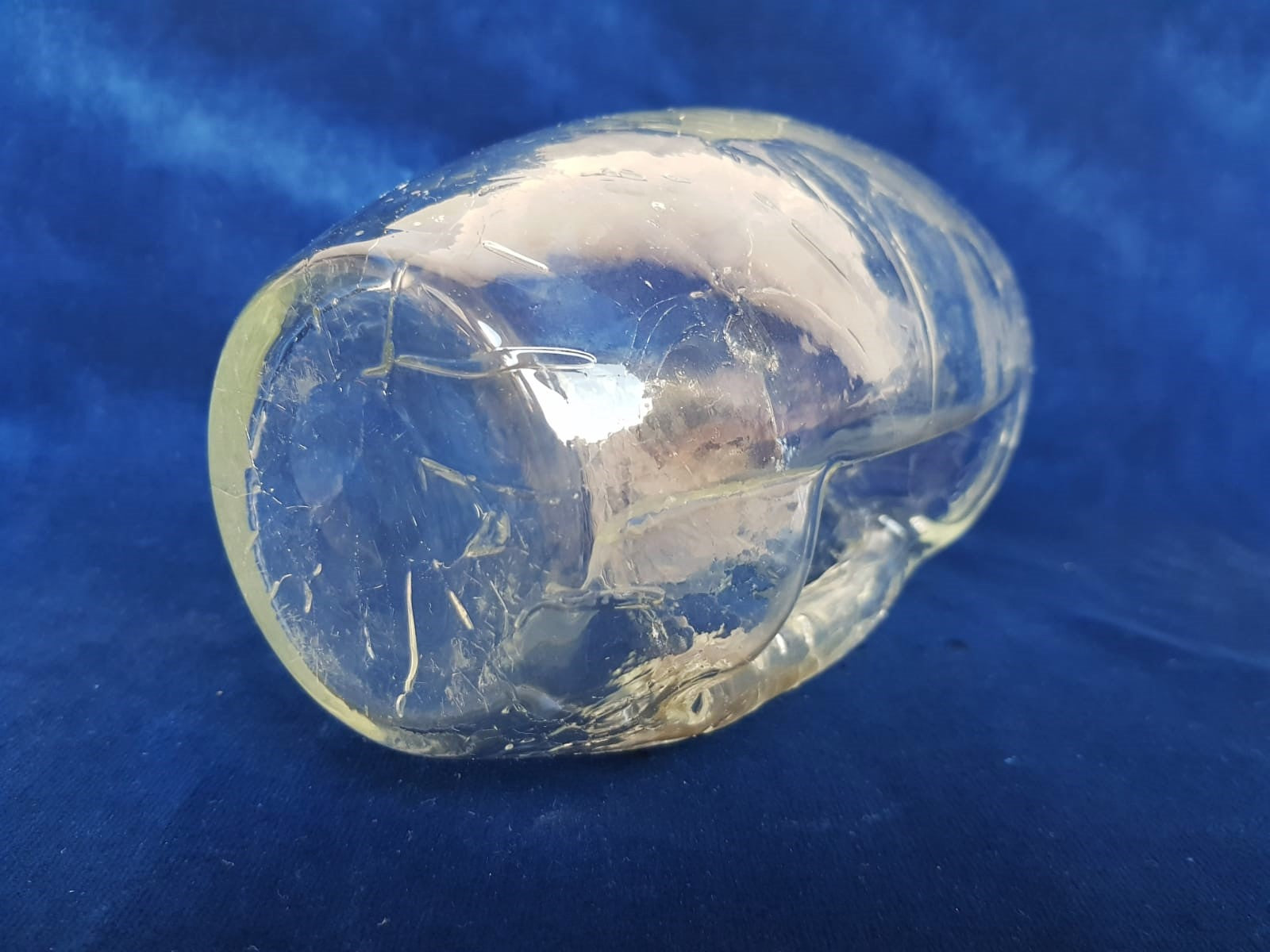 Made from clear, mold-blown glass, its distinctive surface features a crackle finish achieved through shock cooling, evoking the texture of crocodile skin.