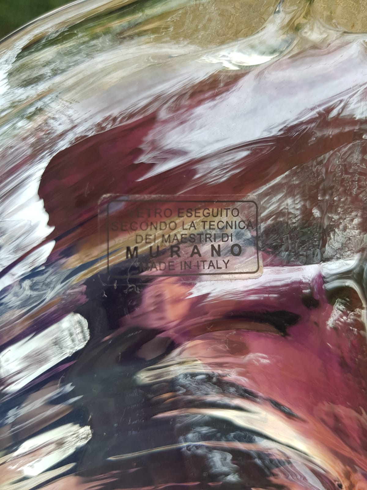Standing 25 cm tall with a 14 cm by 7 cm base and a 26 cm by 22 cm opening, the vase is in excellent condition and bears the authentic Murano mark atop the glass wave.