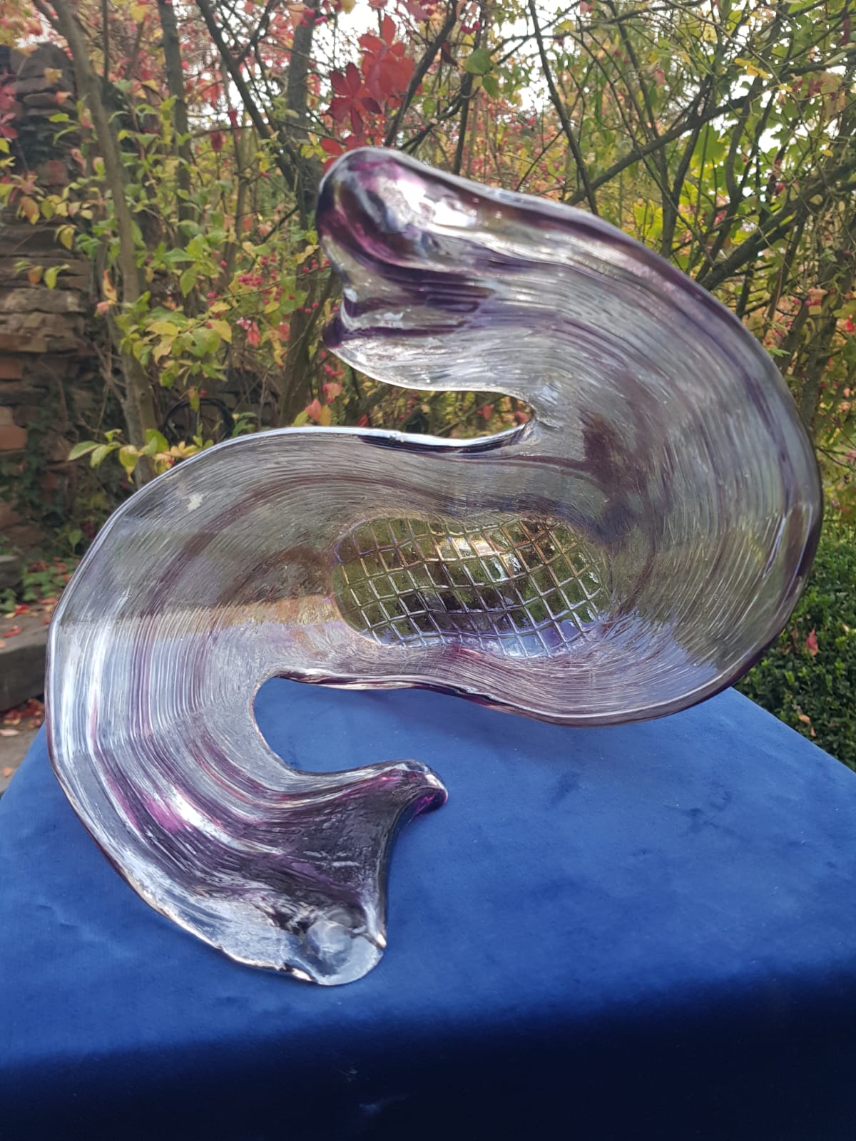 The iridescent finish reveals shifting tones of clear, silver, and purple under varying light, while the ribbed texture enhances its depth and highlights exceptional artistry.