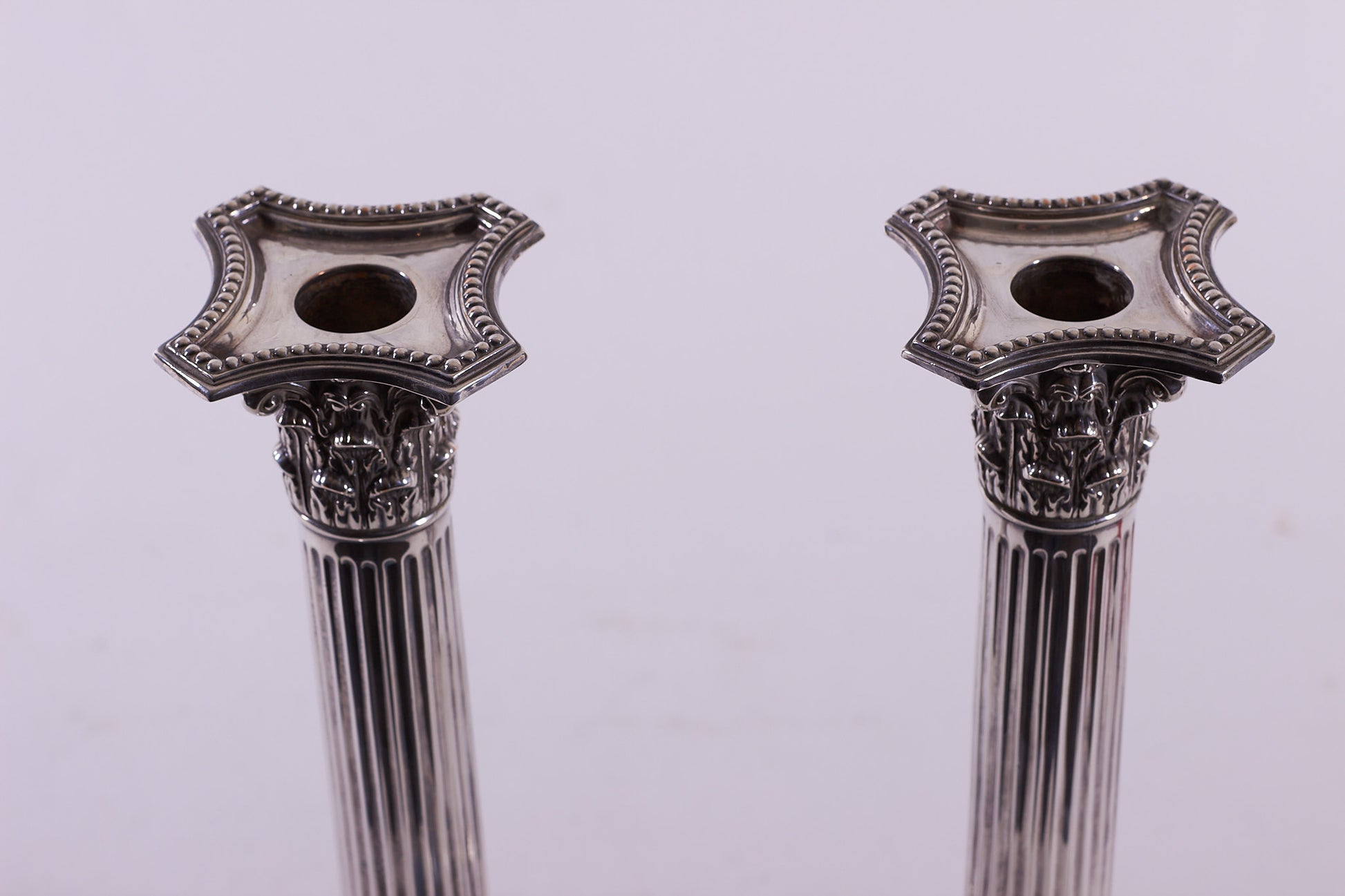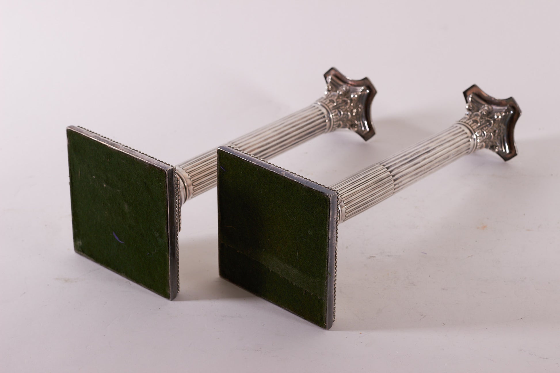 Each piece features a fluted Corinthian column crowned with ornate acanthus leaf capitals, resting upon a stepped square foundation with refined beaded detailing.