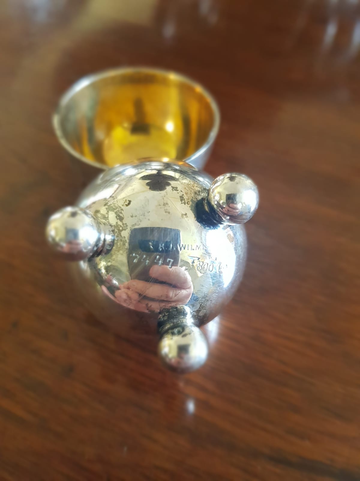 Each piece features a graceful tripod design with gilded interiors—a sophisticated solution that protected the silver from salt corrosion while adding lustrous elegance.