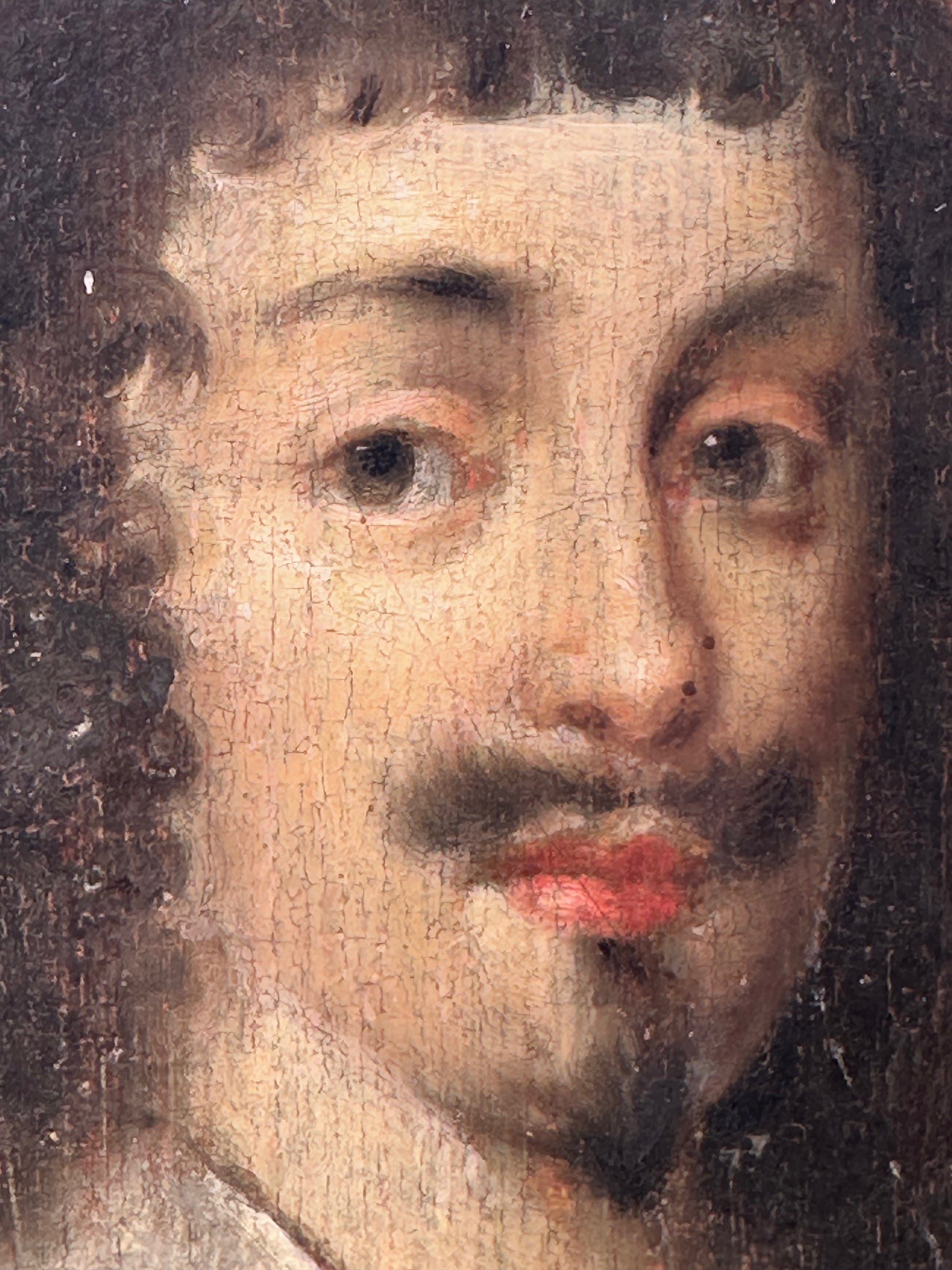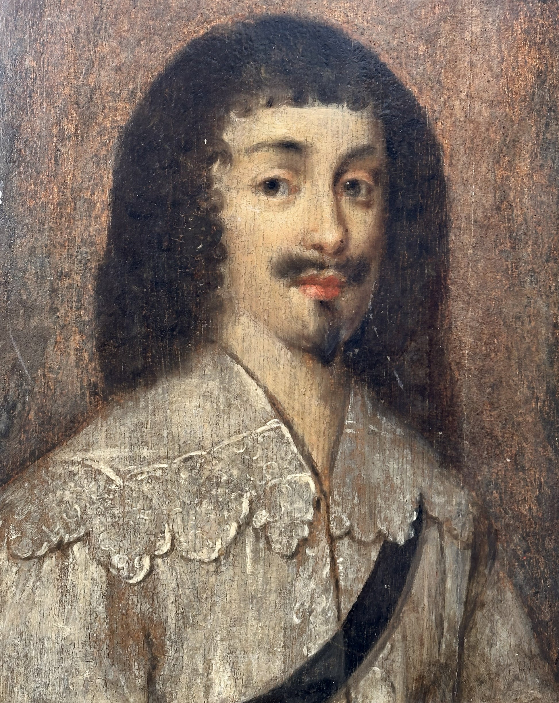 The nobleman is depicted in a restrained three-quarter composition, his dark shoulder-length curls and Van Dyck-style facial hair—the fashionable mustache and goatee of his era—lending him an air of cultivated distinction. His wardrobe speaks to refined taste: muted tones punctuated by an exquisitely rendered white lace collar, that quintessential emblem of period elegance, with a dark sash draped diagonally across his chest. The work bears the authentic character of age with grace—a softened varnish patina and subtle surface variations that underscore its historical authenticity rather than diminish it.