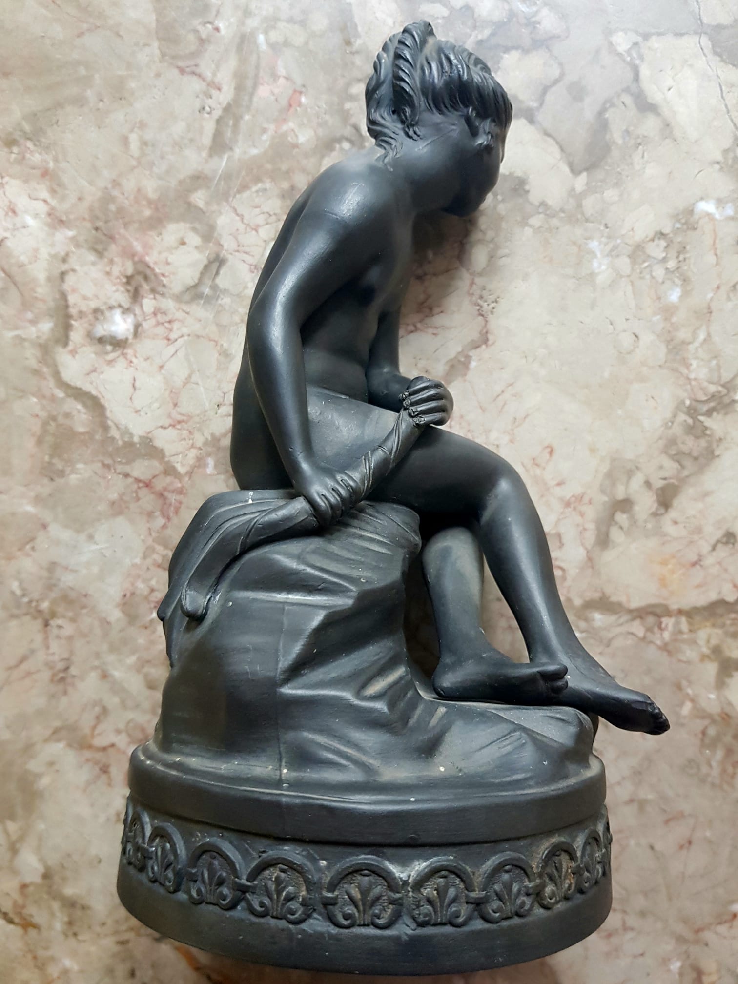 This exquisite 19th-century Wedgwood black basalt figurine depicts Psyche with a bow, embodying refined craftsmanship.