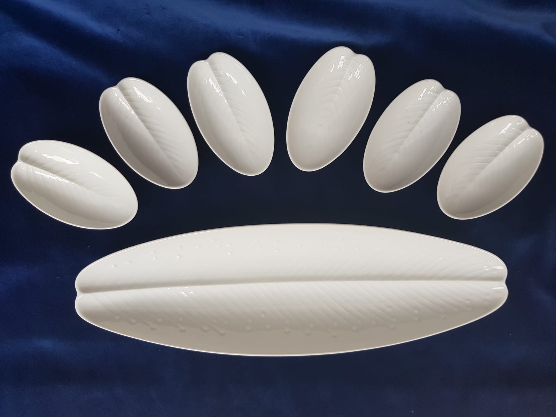 Featuring organic, leaf-inspired forms, this vintage set includes one large leaf-shaped bowl and six smaller bowls, all made from fine white porcelain.