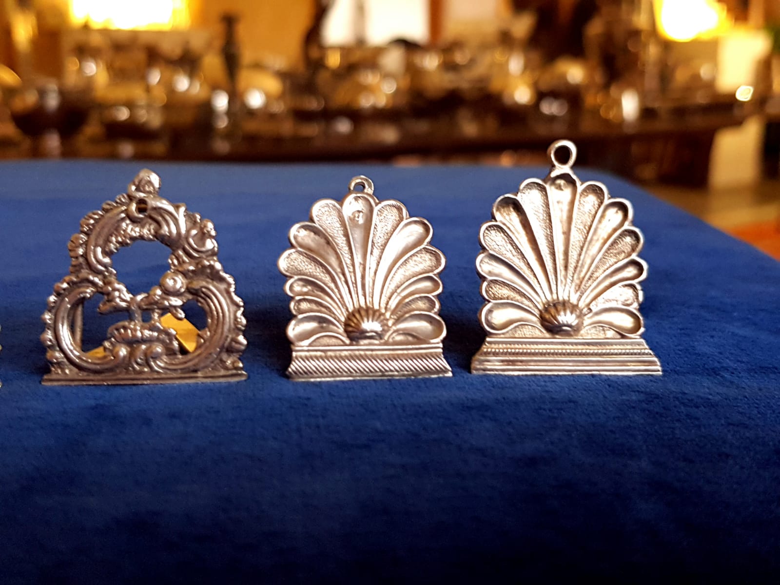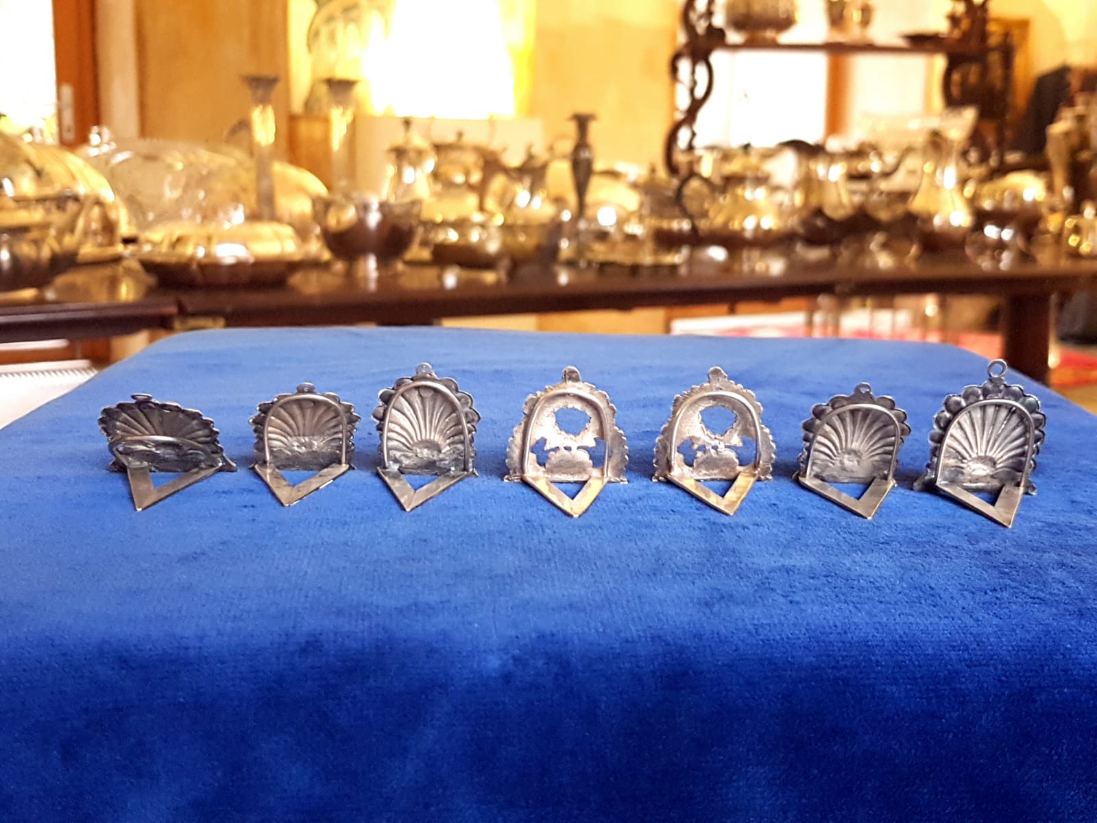 Elevate your formal table settings with this exquisite 7-piece collection of antique silver place card holders.