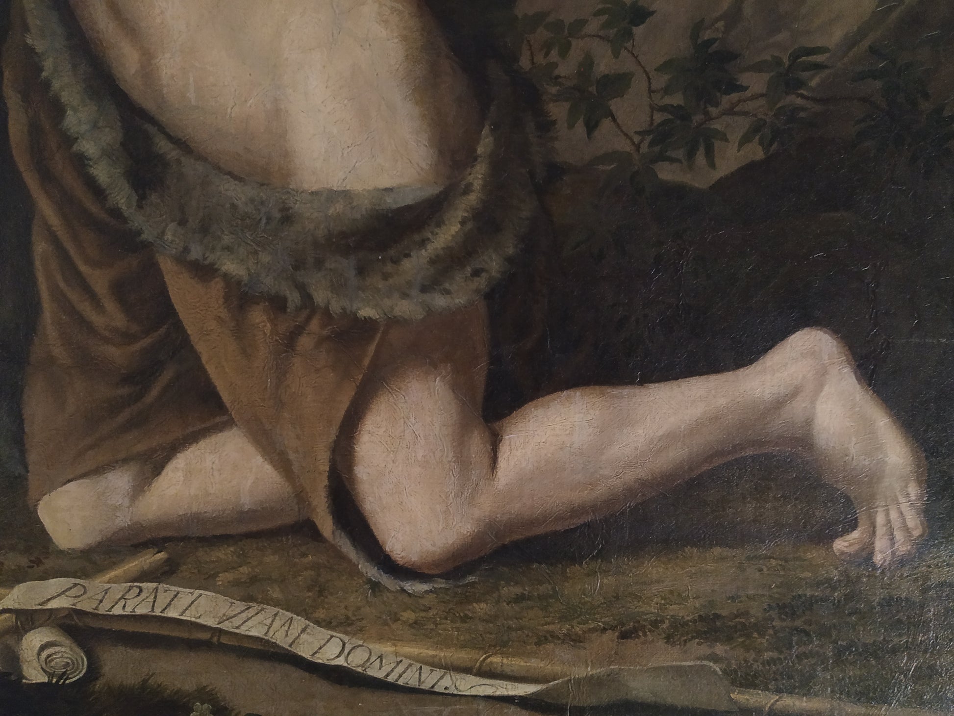 The figure's idealized proportions and camel hair vestments reflect period conventions, while the carefully rendered attributes—the inscribed scroll proclaiming "Ecce Agnus Dei" and the reed cross—establish the work's theological significance.