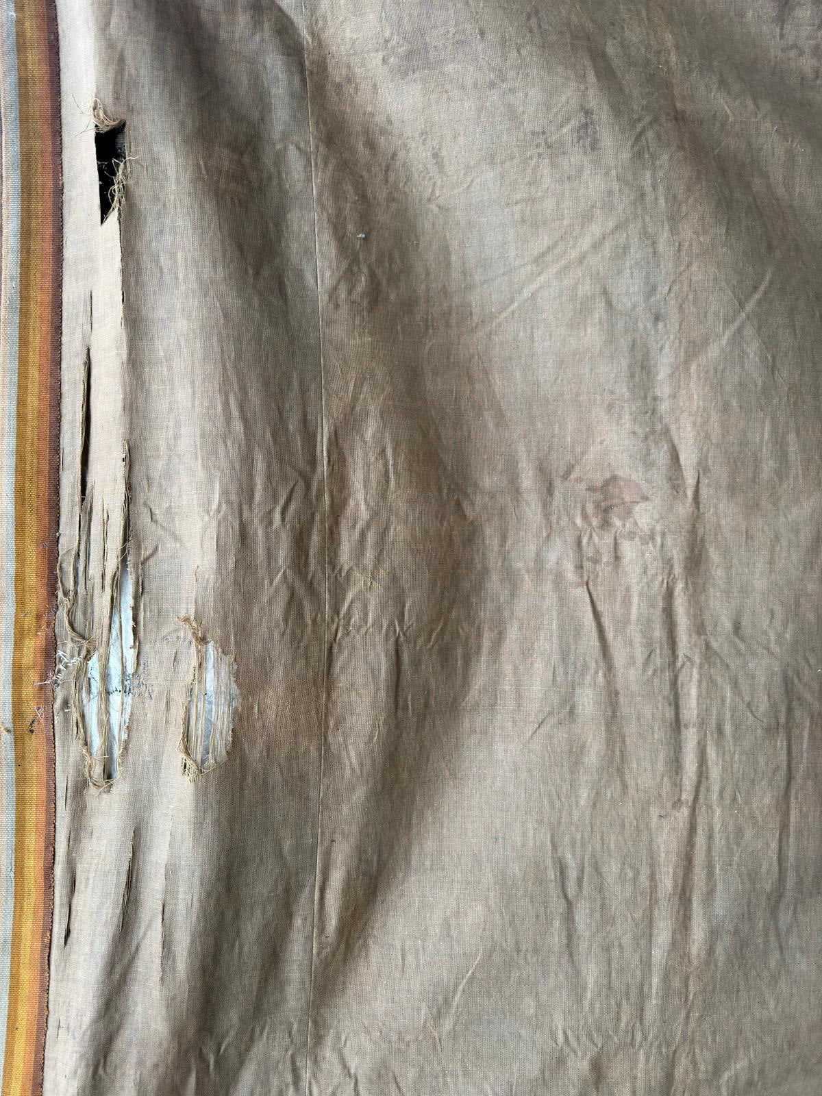 The tapestry presents extensive wear and tear and old restorations, but it displays very well.