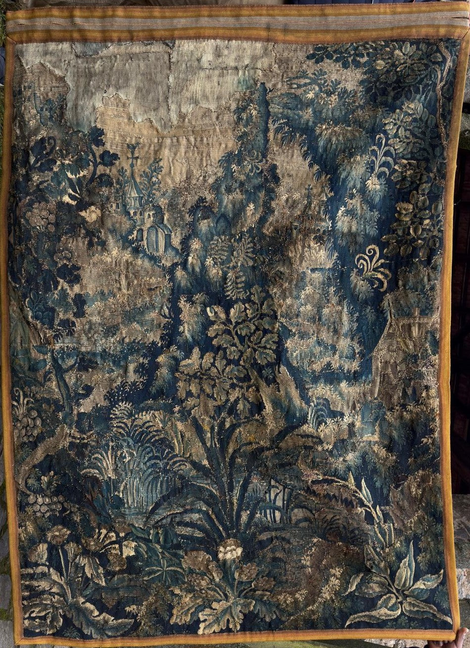 A refined example of French Verdure weaving from the late 17th or early 18th century, this handwoven wool tapestry embodies the pastoral aesthetic that defined European textile art of its era.