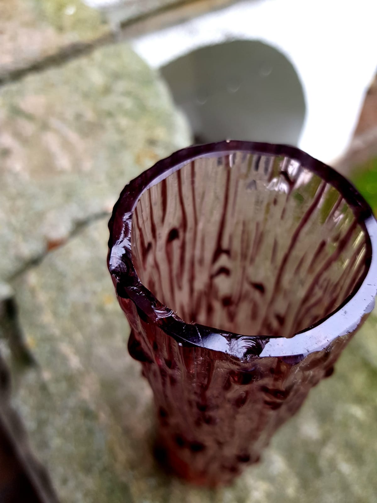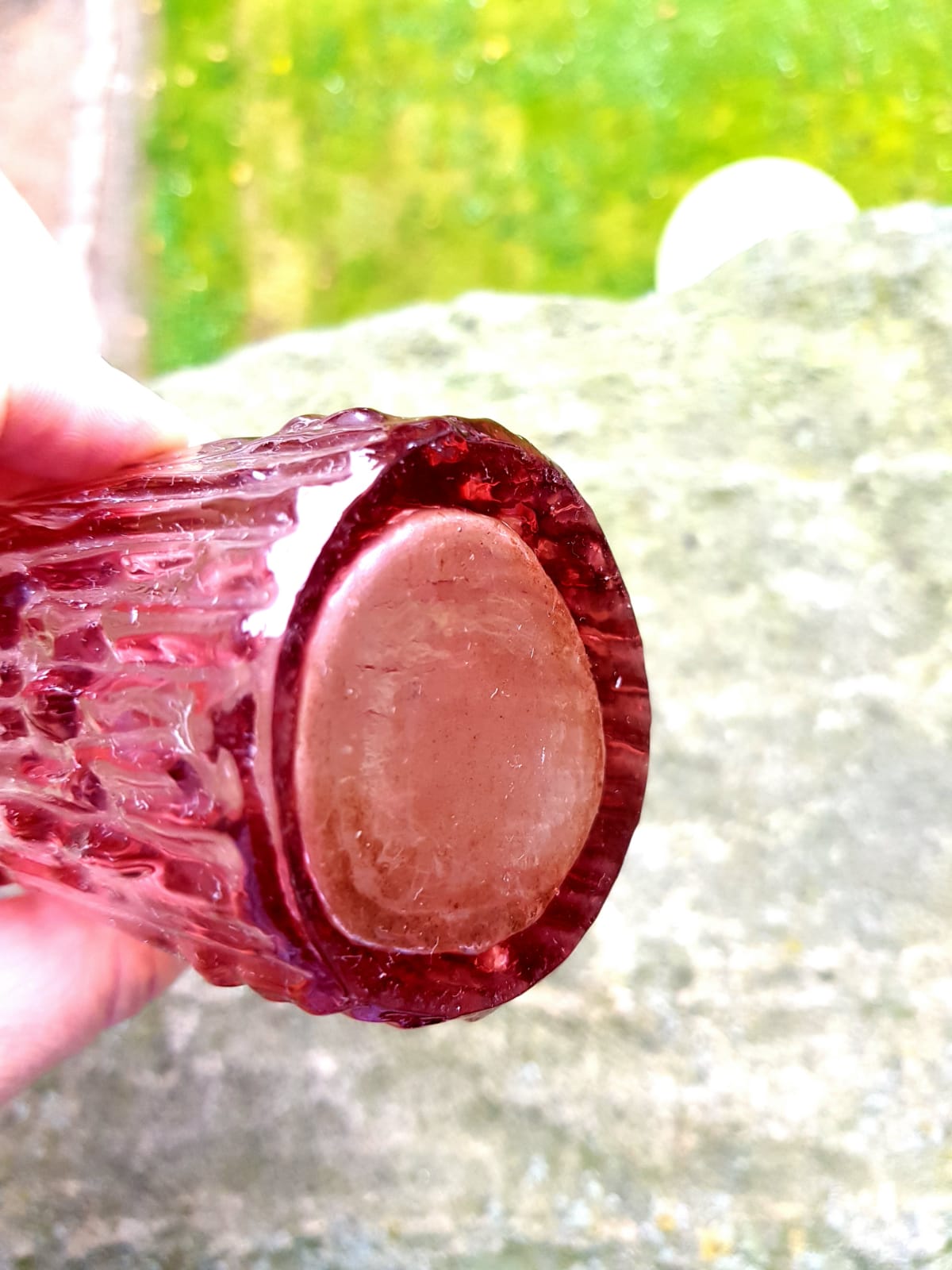 Crafted from pressed cranberry-colored glass, it stands 23 cm tall with a 6 cm diameter.