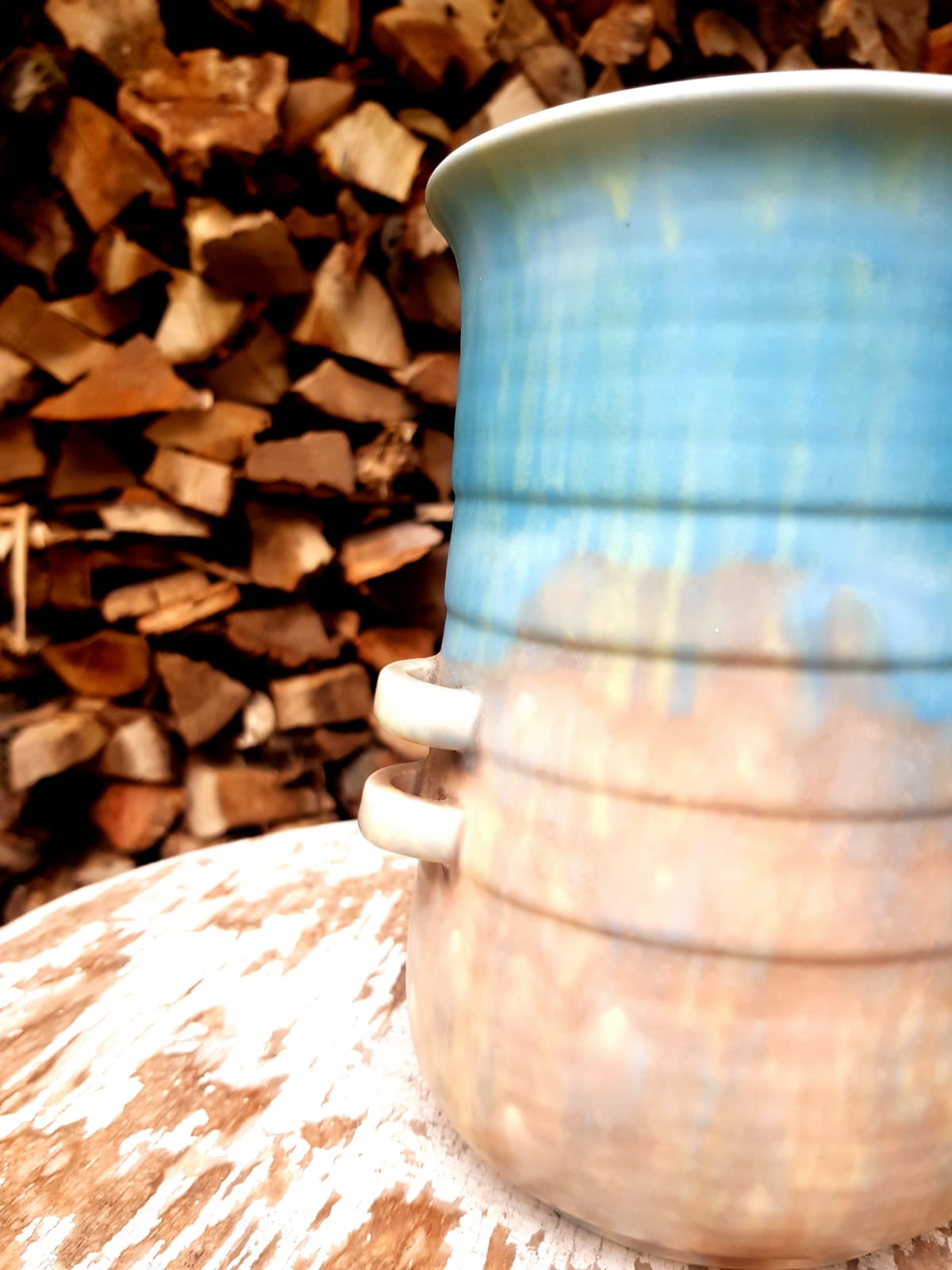 It features a mesmerizing reactive glaze that gracefully shifts from a soft sky-blue at the top to gentle brown and beige hues near the base. Accentuated by three delicate, subtle handles on its sides, the vase exudes a refined rustic charm.