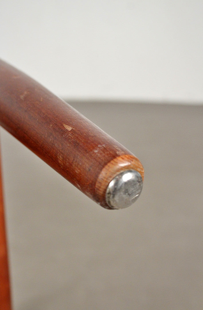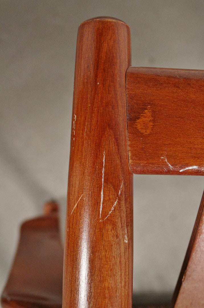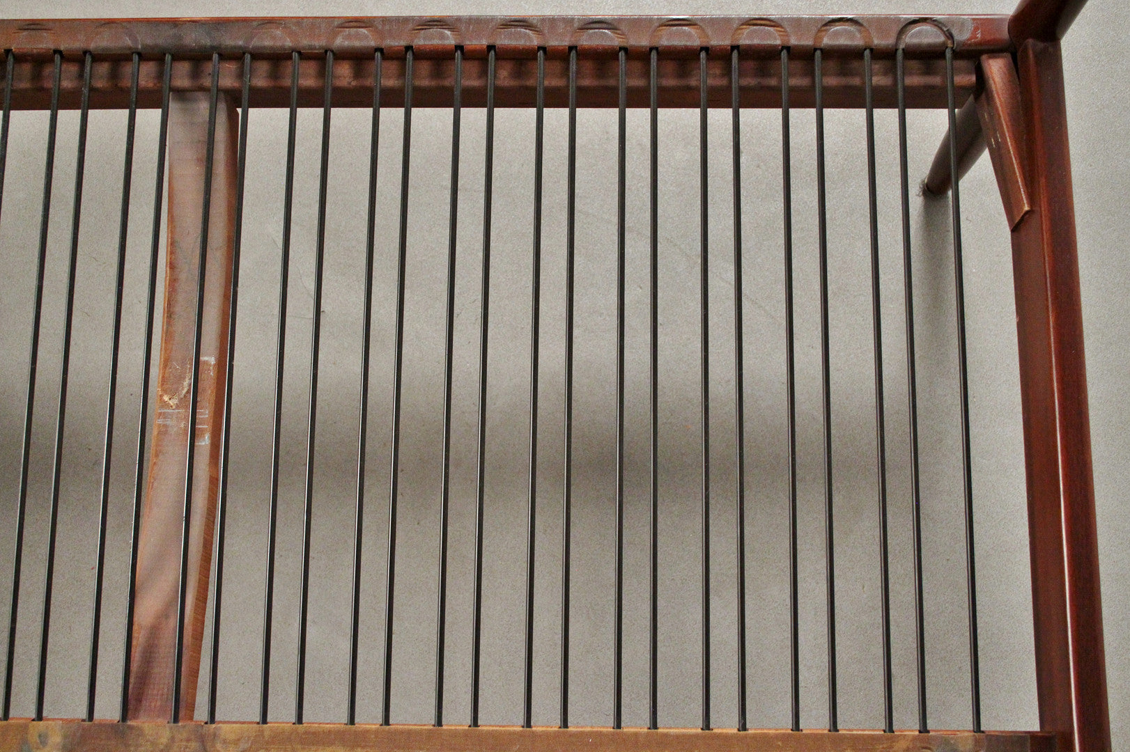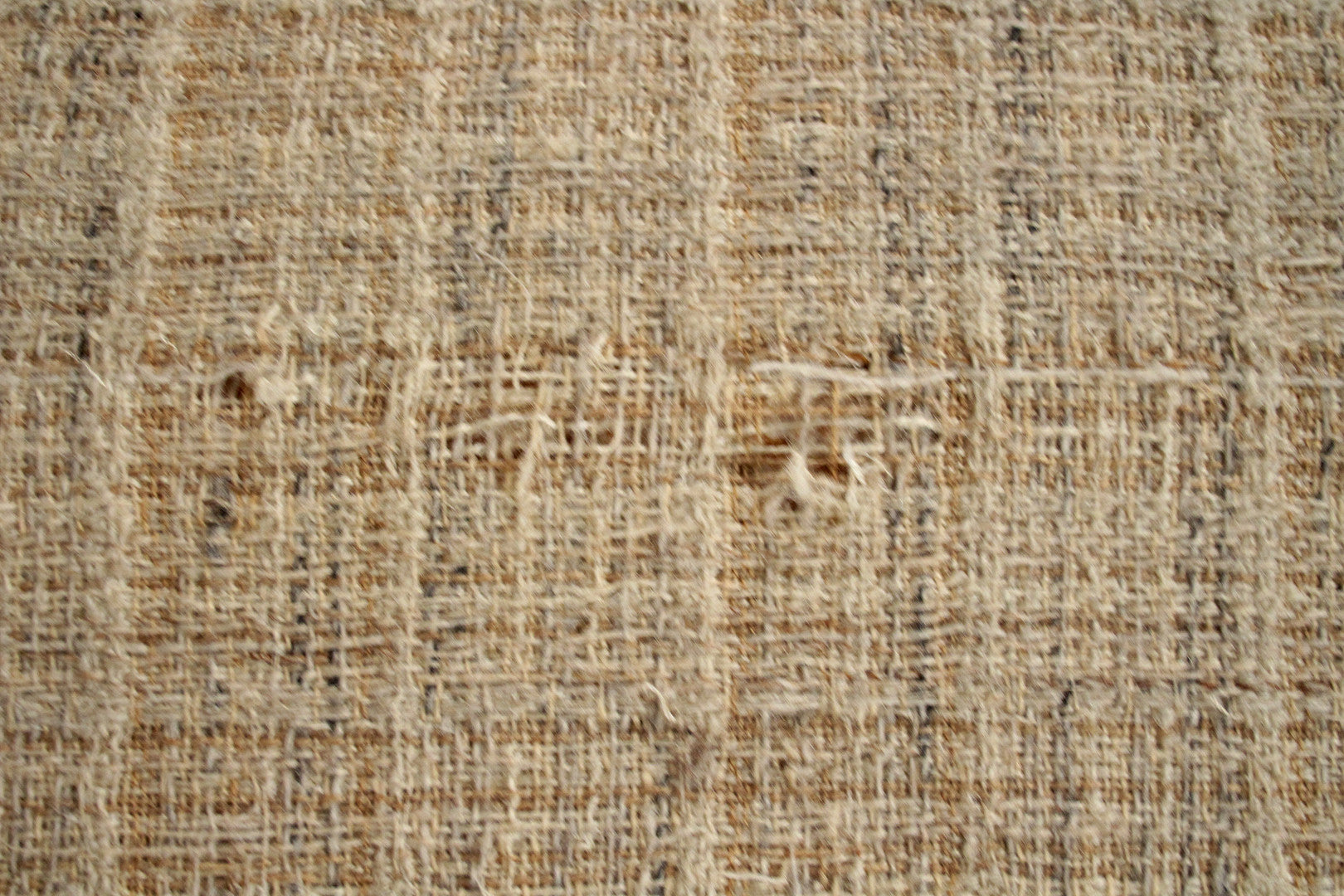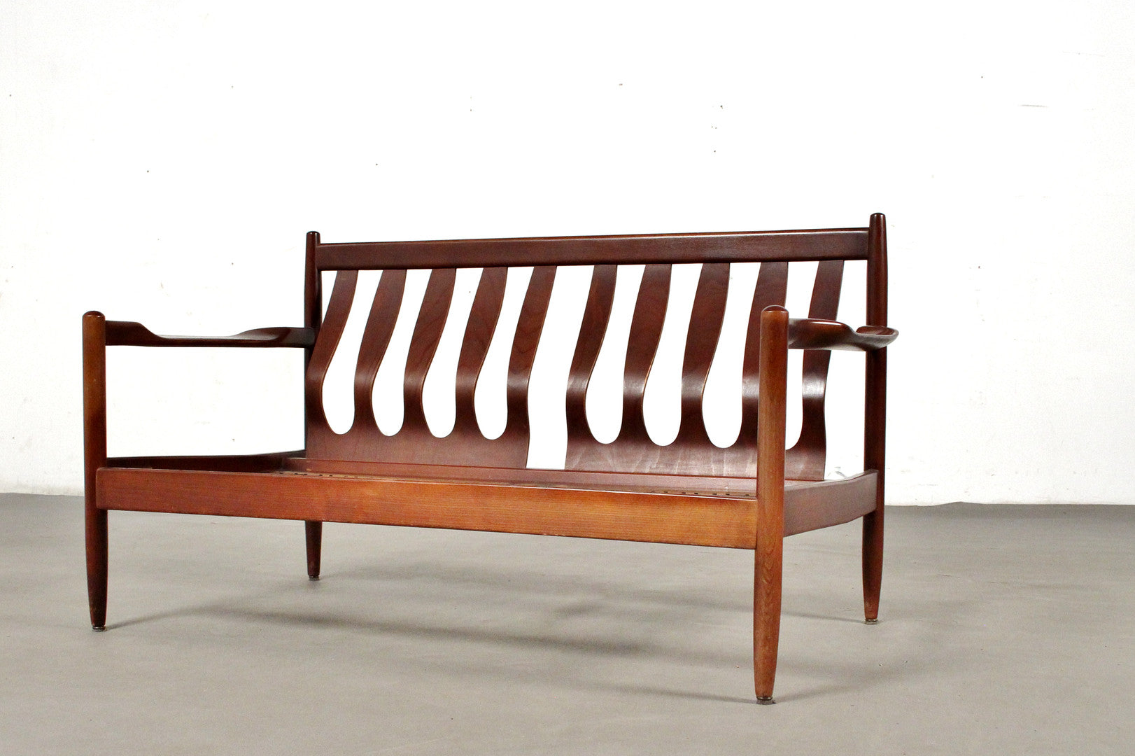 Age-related some scratches and colored abrasion, in the area of the armrests the clear coat is also partially rubbed, felt protectors were partly glued to the wood later on, the cover is somewhat faded, soiled and on some seat cushions also clearly to heavily rubbed and has fabric defects.